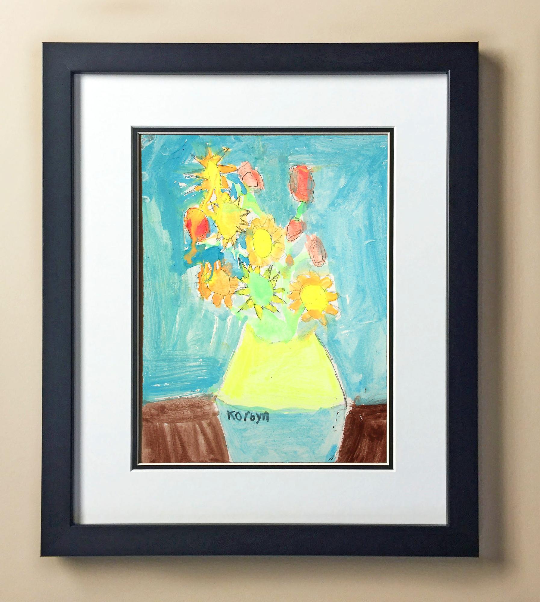 Included with the purchase is the Students Artwork, Frame, double matboard, shatter proof plexiglass, and a ready to hang backerboard with turnbuttons