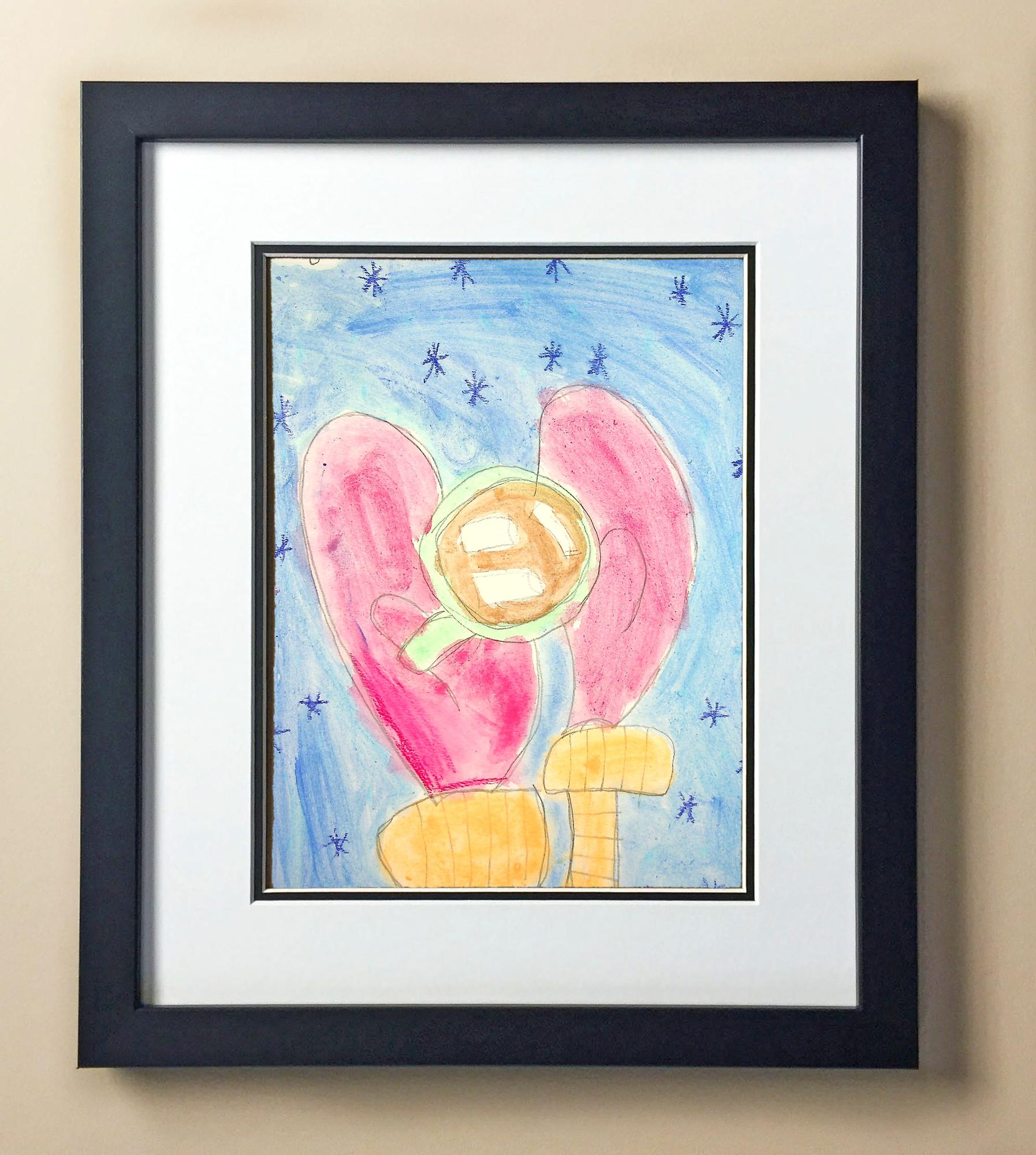 Included with the purchase is the Students Artwork, Frame, double matboard, shatter proof plexiglass, and a ready to hang backerboard with turnbuttons