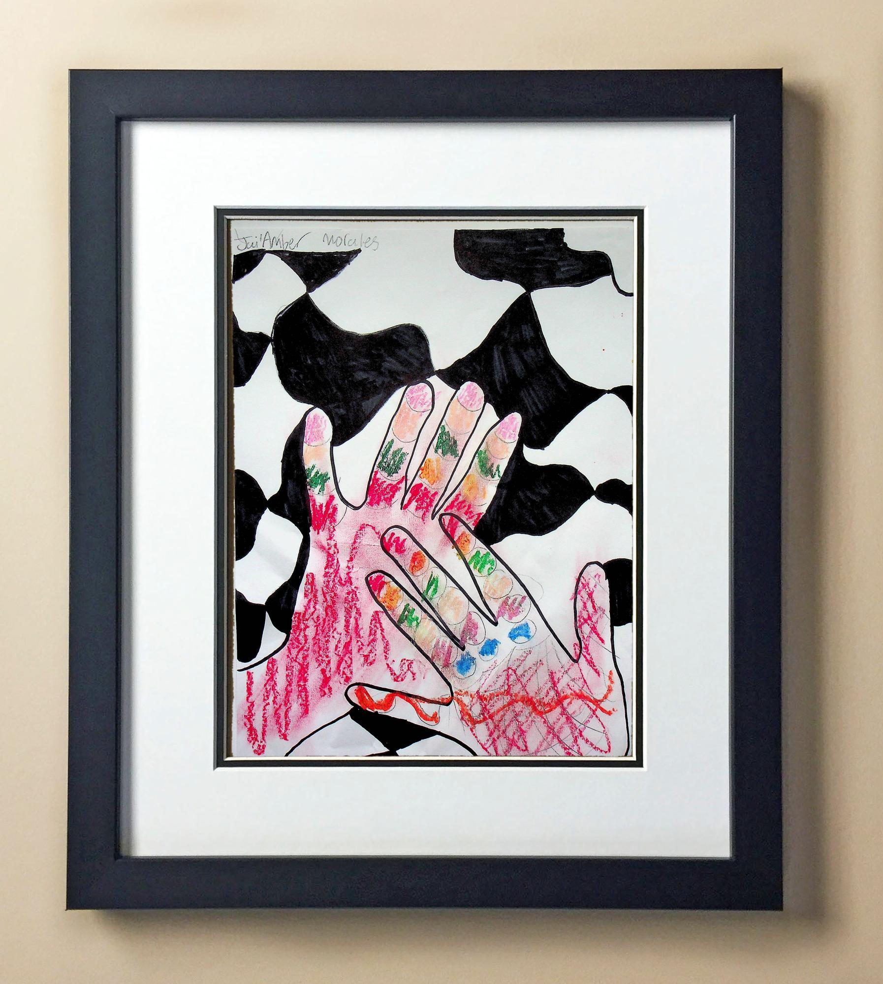 Included with the purchase is the Students Artwork, Frame, double matboard, shatter proof plexiglass, and a ready to hang backerboard with turnbuttons