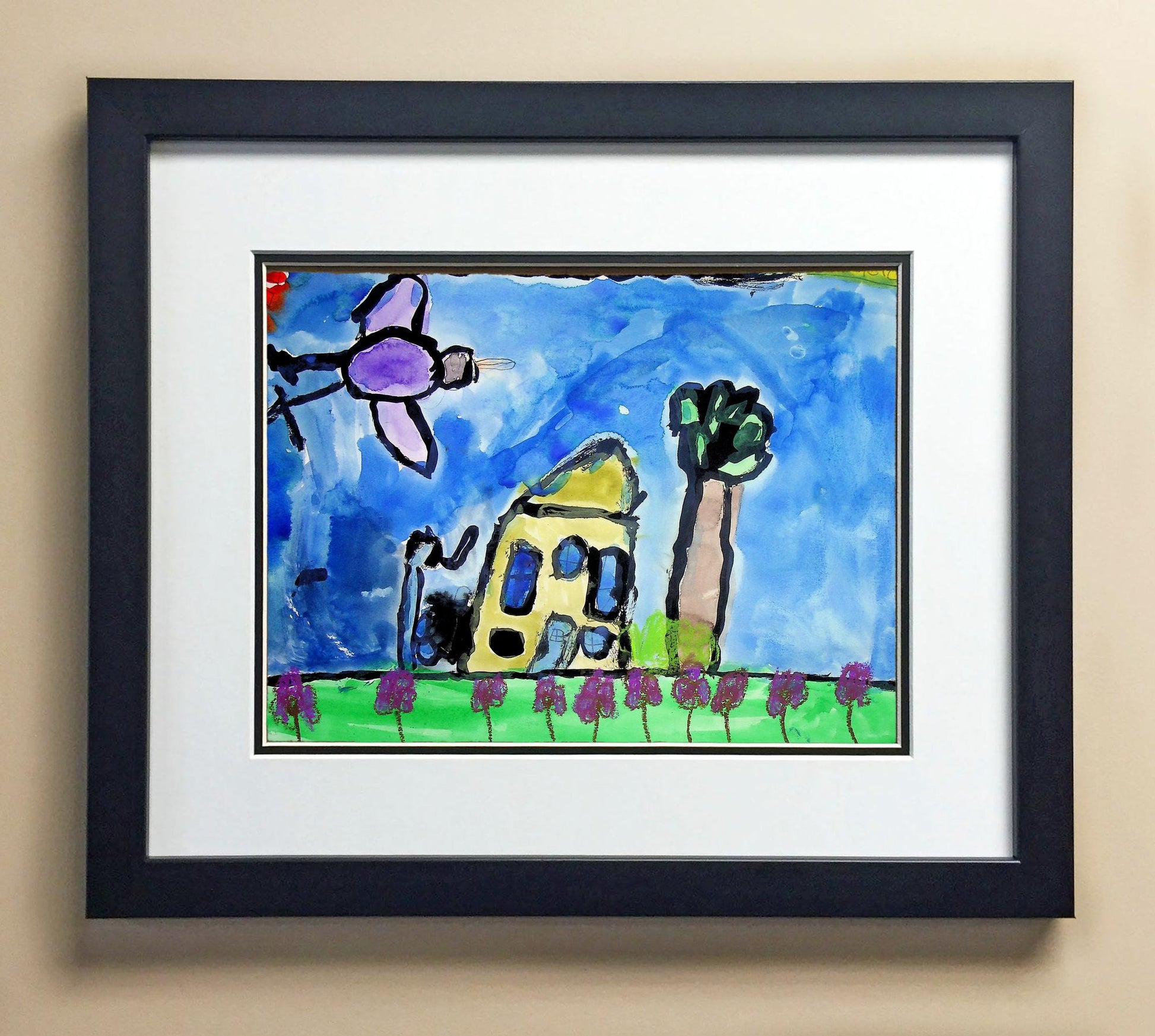 Included with the purchase is the Students Artwork, Frame, double matboard, shatter proof plexiglass, and a ready to hang backerboard with turnbuttons
