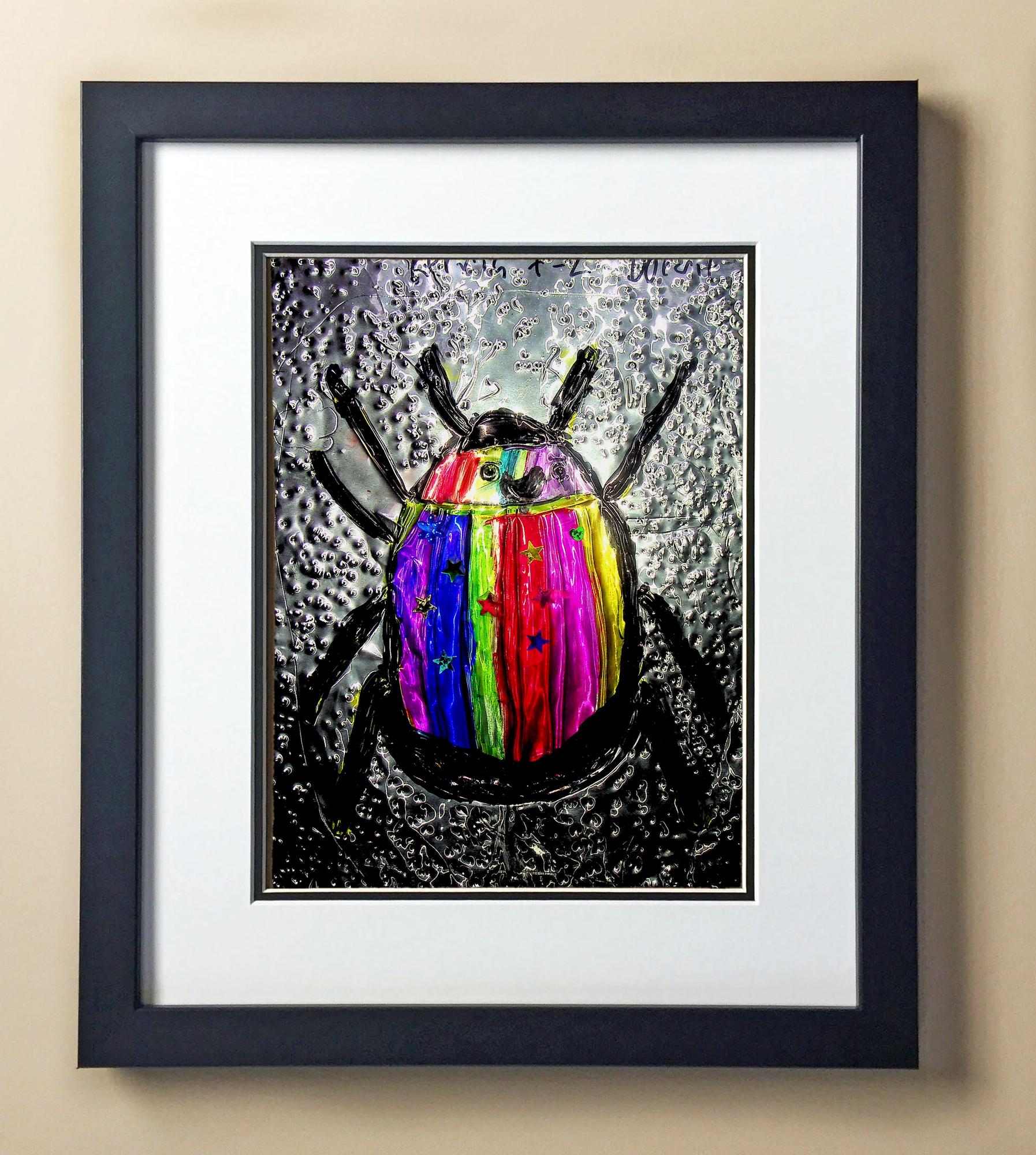 Included with the purchase is the Students Artwork, Frame, double matboard, shatter proof plexiglass, and a ready to hang backerboard with turnbuttons