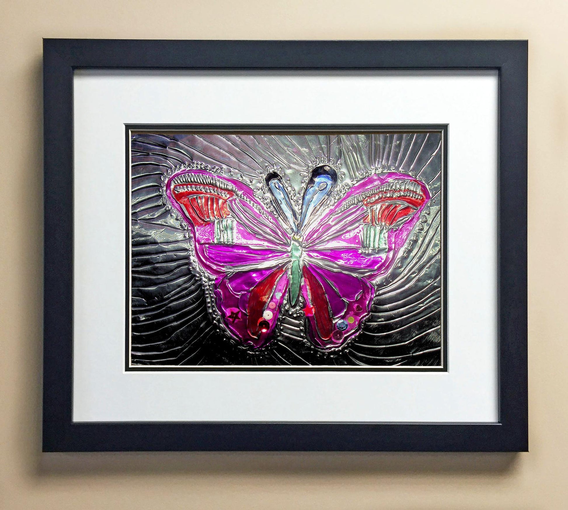 Included with the purchase is the Students Artwork, Frame, double matboard, shatter proof plexiglass, and a ready to hang backerboard with turnbuttons