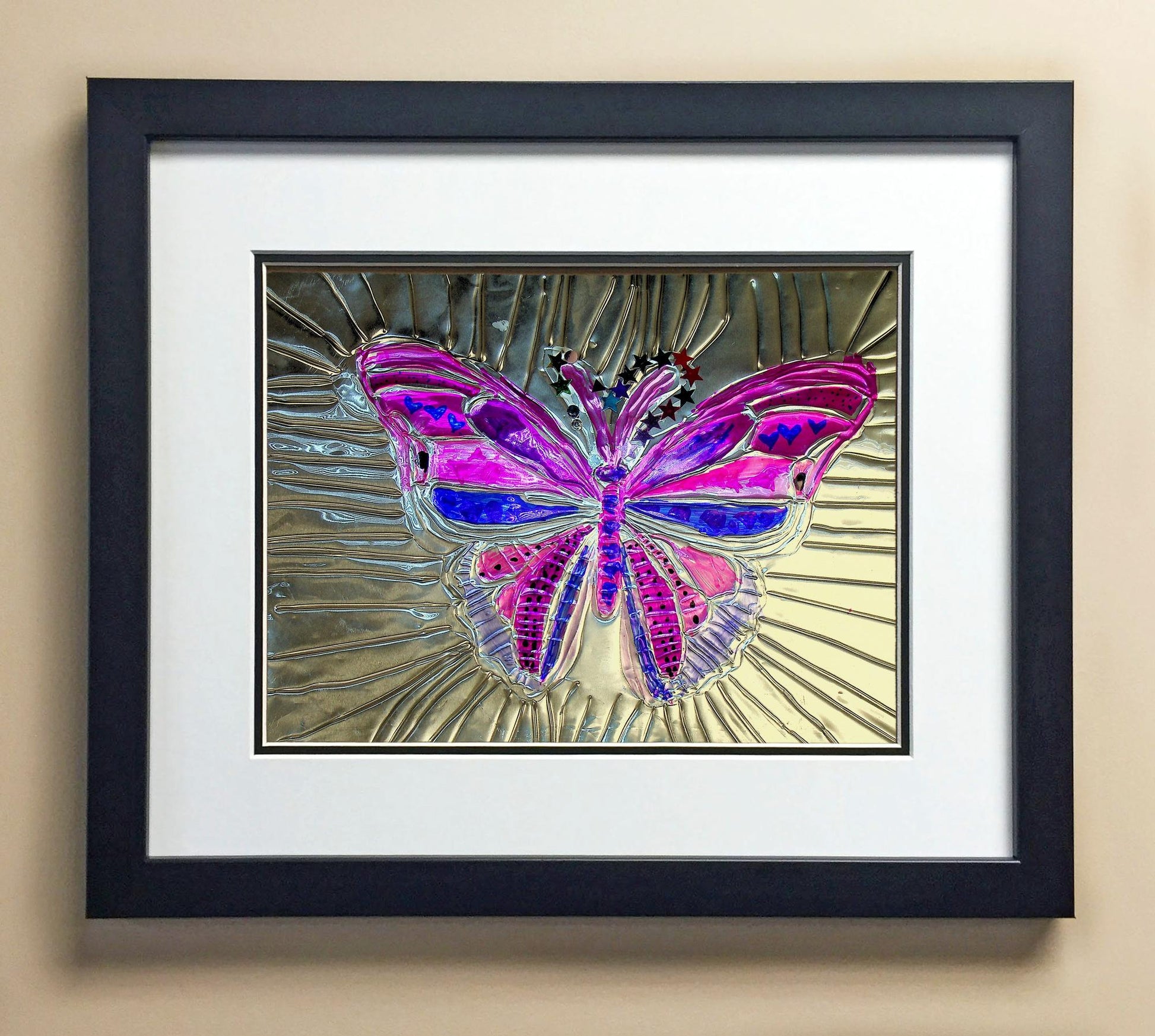 Included with the purchase is the Students Artwork, Frame, double matboard, shatter proof plexiglass, and a ready to hang backerboard with turnbuttons