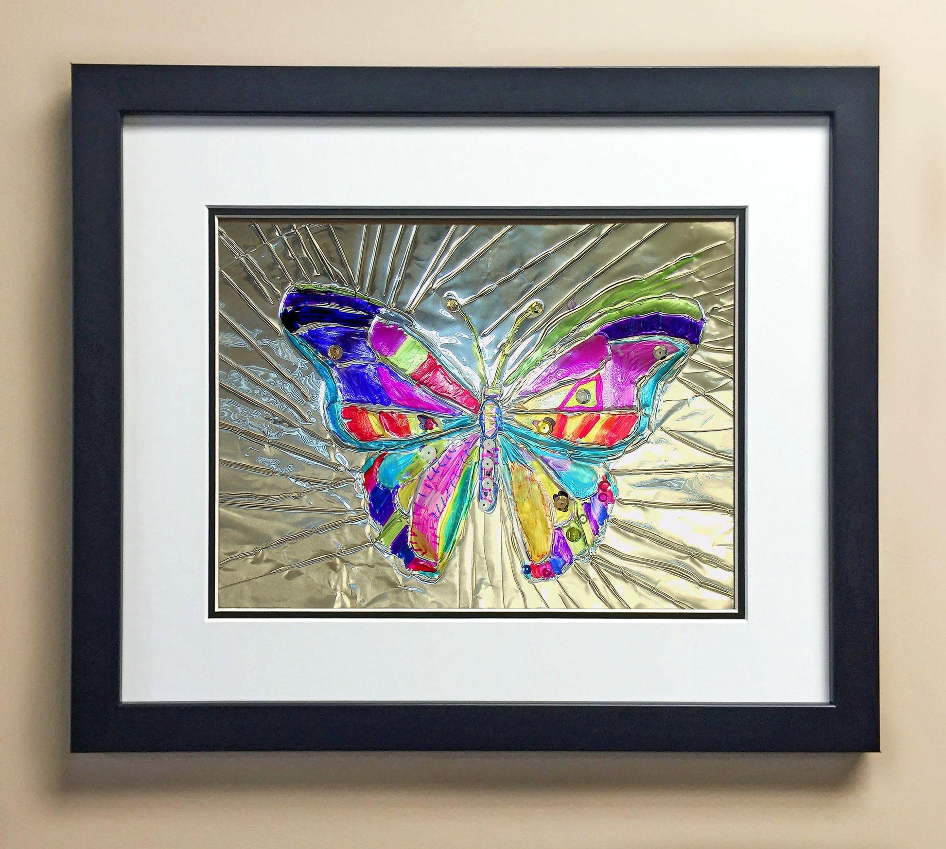 Included with the purchase is the Students Artwork, Frame, double matboard, shatter proof plexiglass, and a ready to hang backerboard with turnbuttons