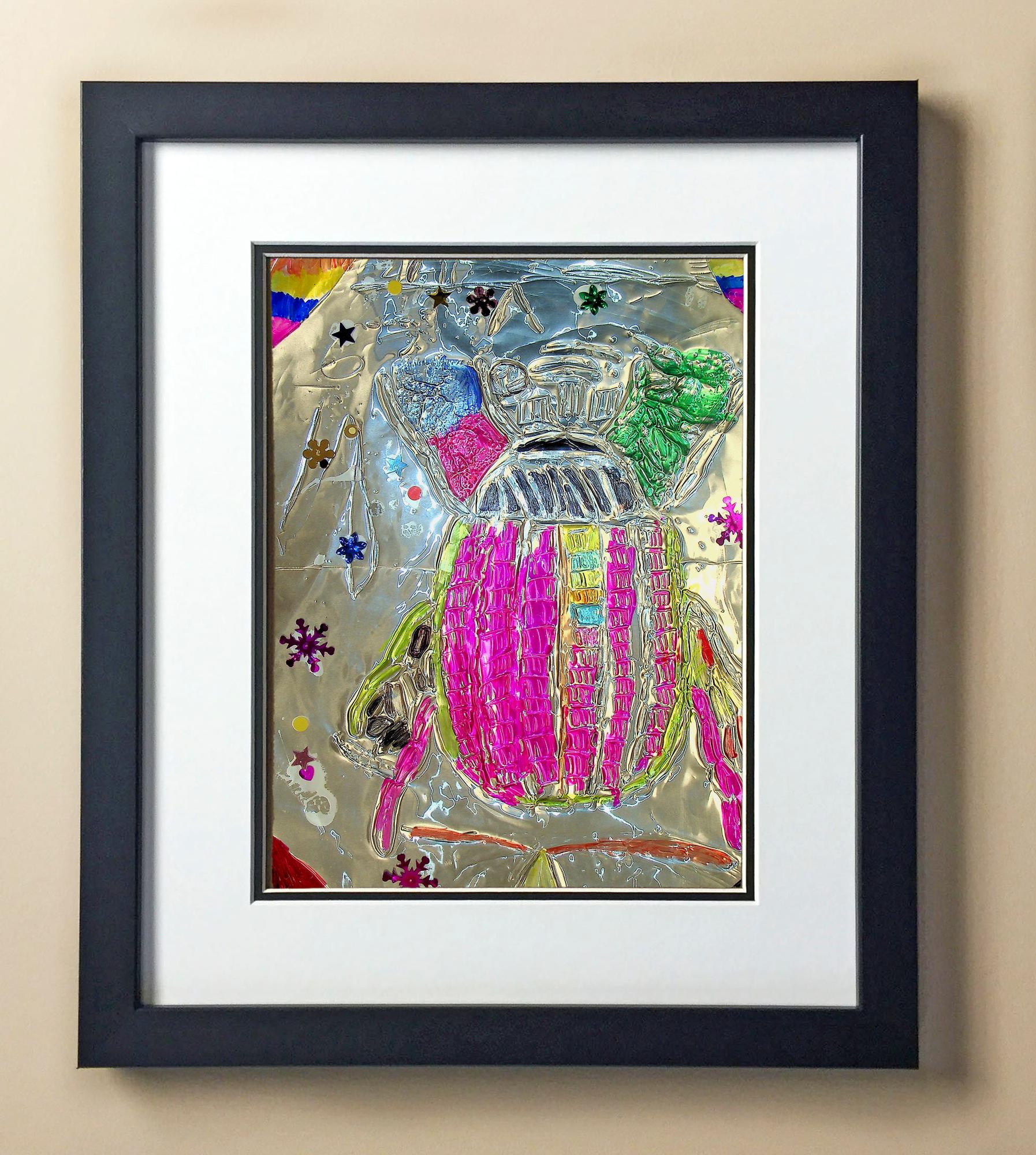 Included with the purchase is the Students Artwork, Frame, double matboard, shatter proof plexiglass, and a ready to hang backerboard with turnbuttons
