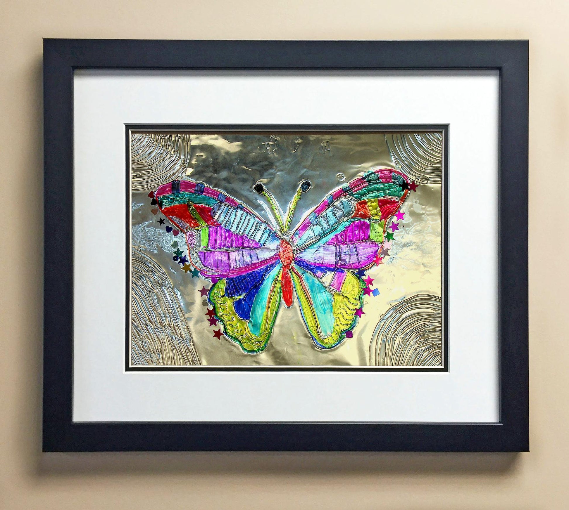 Included with the purchase is the Students Artwork, Frame, double matboard, shatter proof plexiglass, and a ready to hang backerboard with turnbuttons