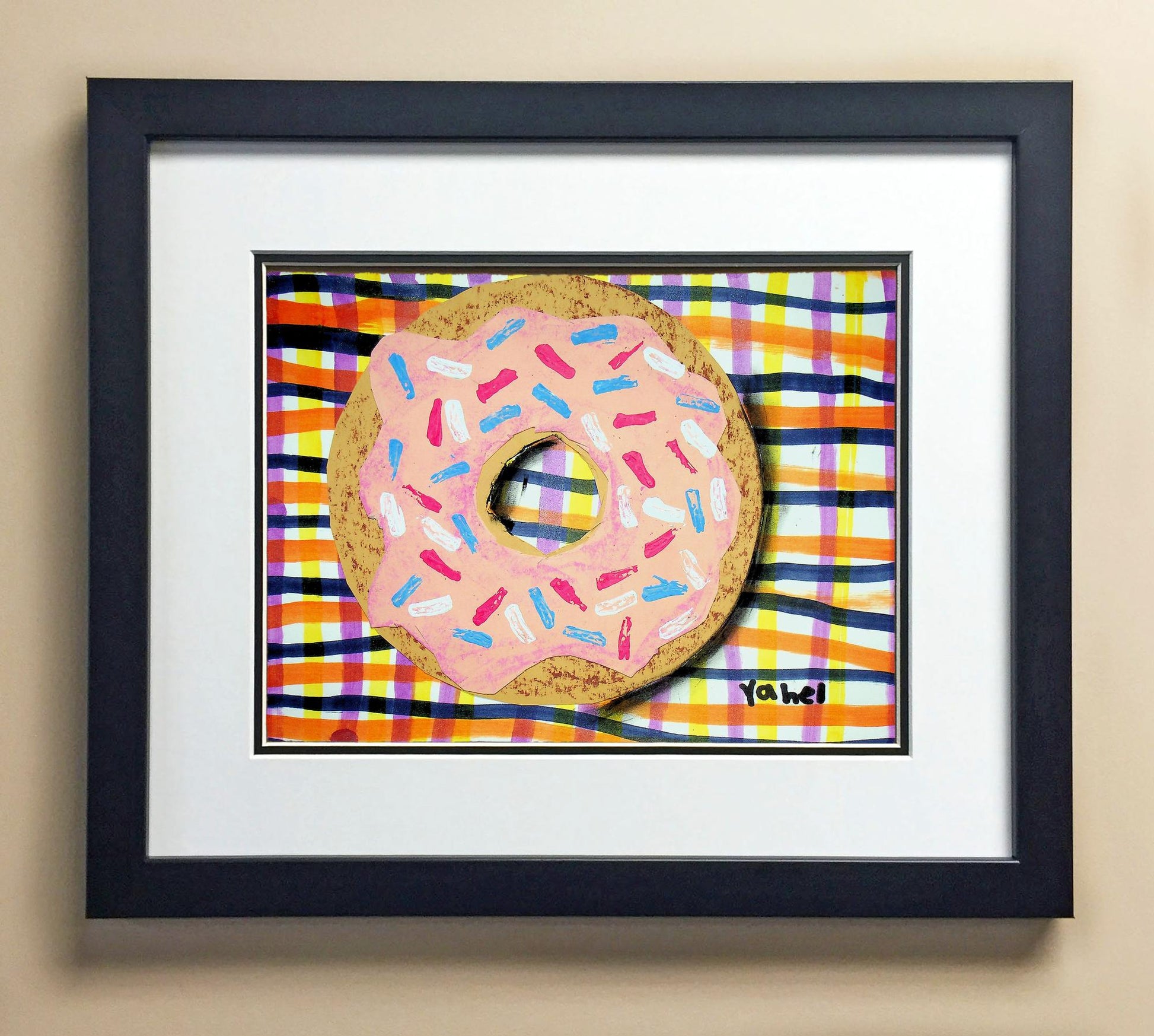 Included with the purchase is the Students Artwork, Frame, double matboard, shatter proof plexiglass, and a ready to hang backerboard with turnbuttons