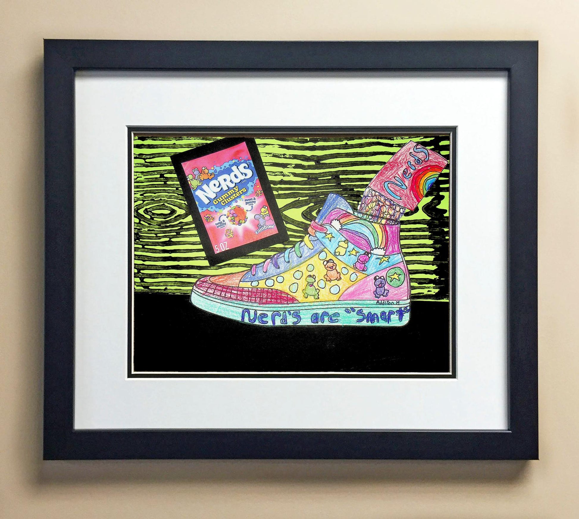 Included with the purchase is the Students Artwork, Frame, double matboard, shatter proof plexiglass, and a ready to hang backerboard with turnbuttons