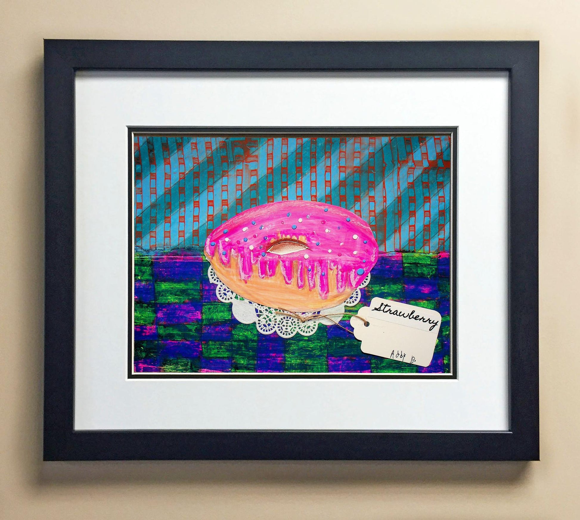 Included with the purchase is the Students Artwork, Frame, double matboard, shatter proof plexiglass, and a ready to hang backerboard with turnbuttons