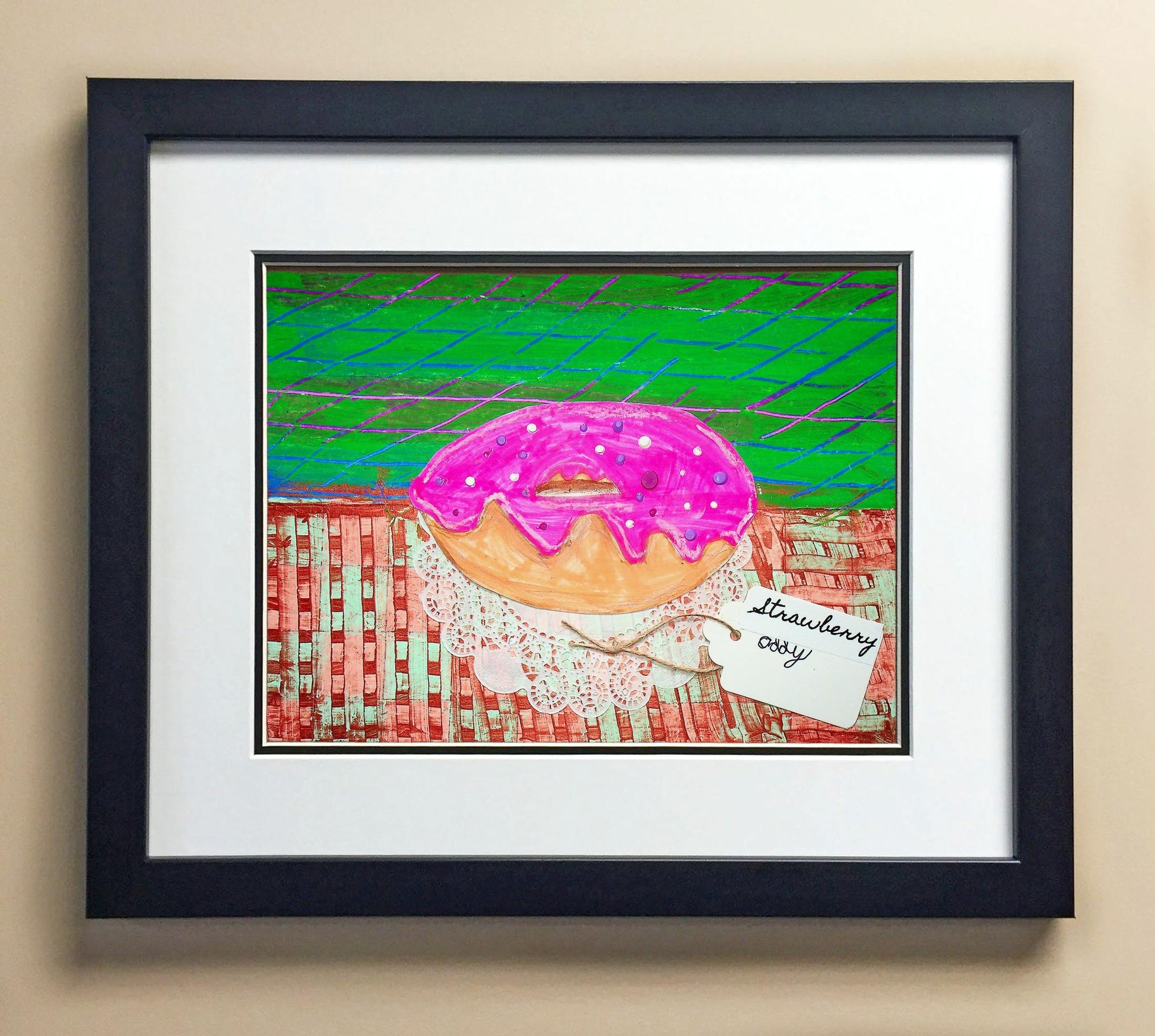 Included with the purchase is the Students Artwork, Frame, double matboard, shatter proof plexiglass, and a ready to hang backerboard with turnbuttons