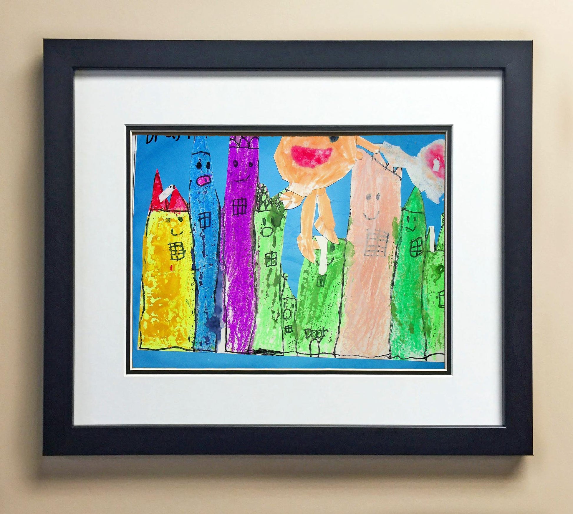 Included with the purchase is the Students Artwork, Frame, double matboard, shatter proof plexiglass, and a ready to hang backerboard with turnbuttons