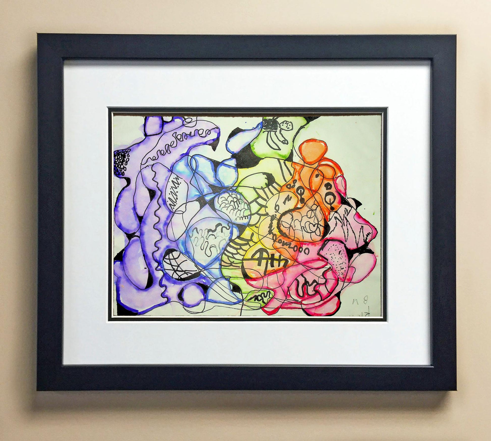Included with the purchase is the Students Artwork, Frame, double matboard, shatter proof plexiglass, and a ready to hang backerboard with turnbuttons