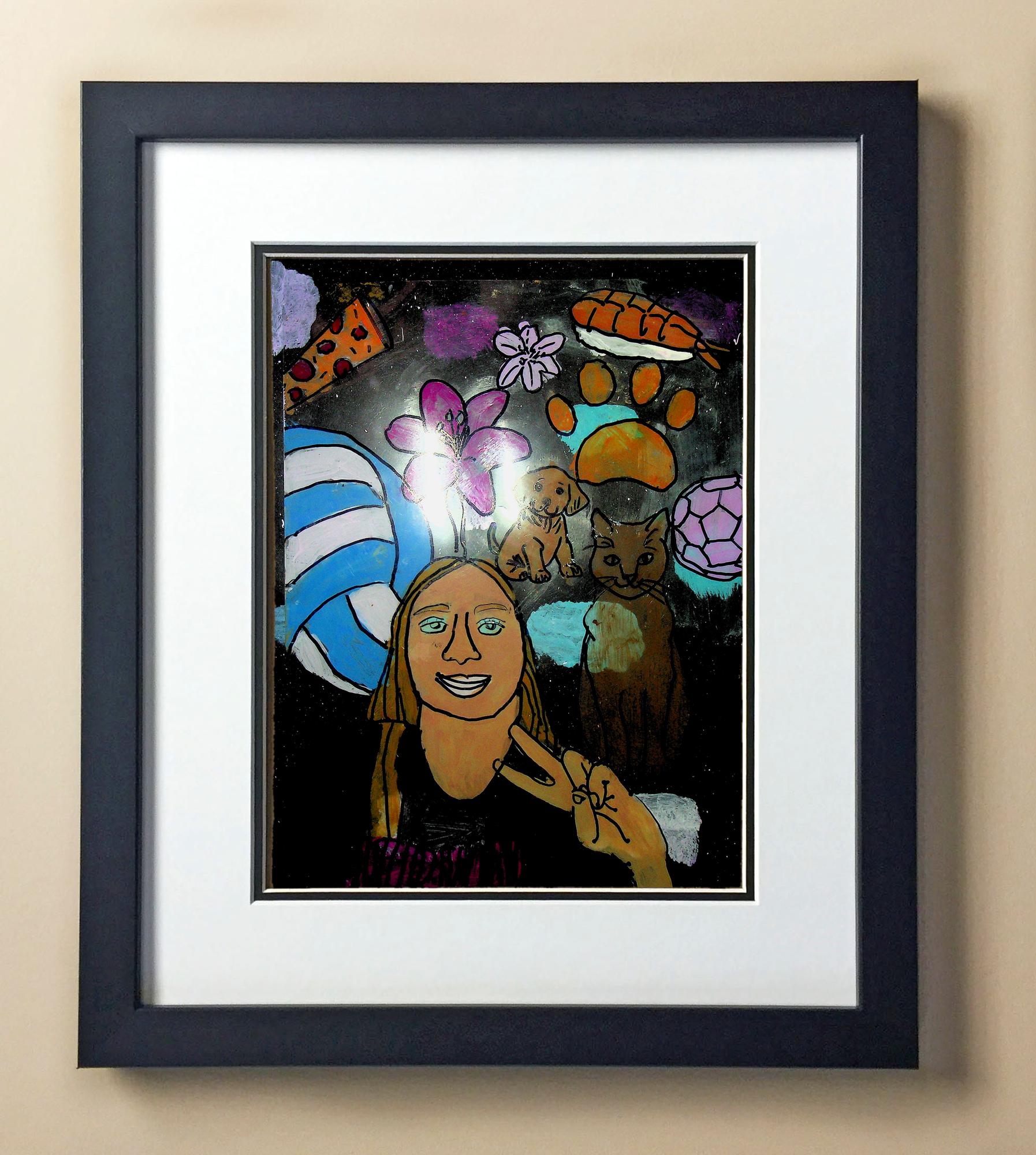 Included with the purchase is the Students Artwork, Frame, double matboard, shatter proof plexiglass, and a ready to hang backerboard with turnbuttons