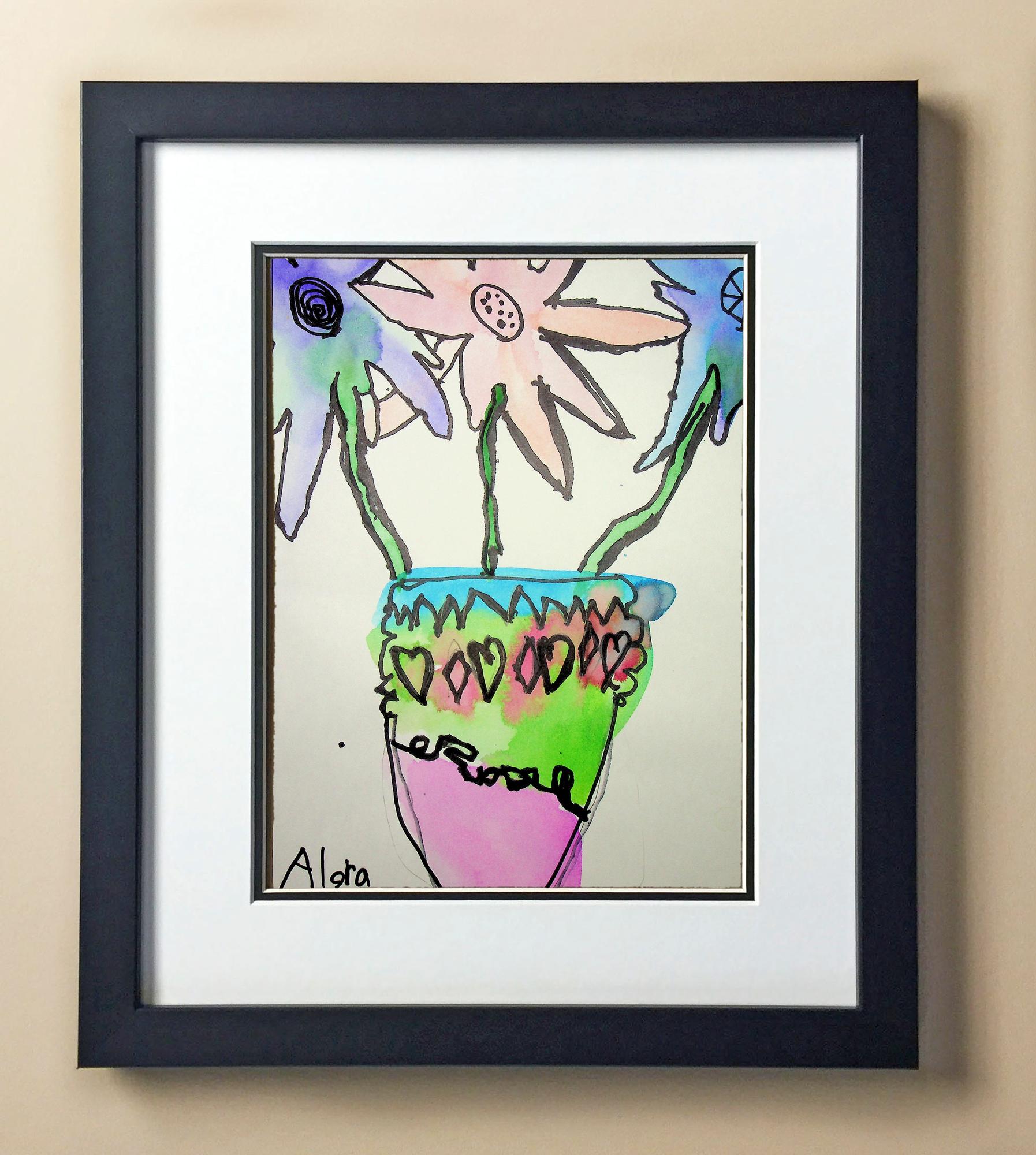 Included with the purchase is the Students Artwork, Frame, double matboard, shatter proof plexiglass, and a ready to hang backerboard with turnbuttons
