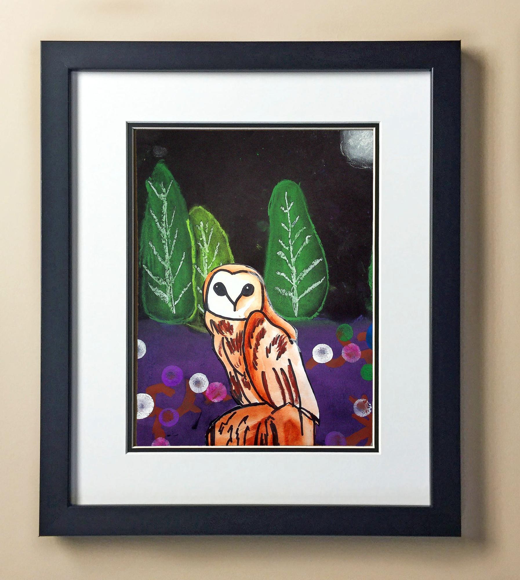 Included with the purchase is the Students Artwork, Frame, double matboard, shatter proof plexiglass, and a ready to hang backerboard with turnbuttons