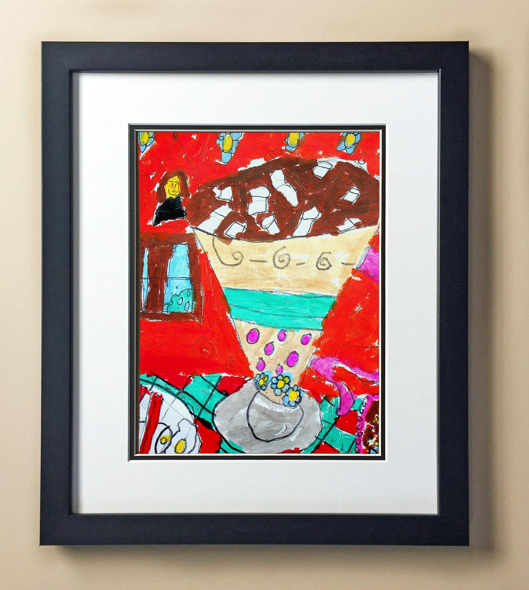Included with the purchase is the Students Artwork, Frame, double matboard, shatter proof plexiglass, and a ready to hang backerboard with turnbuttons