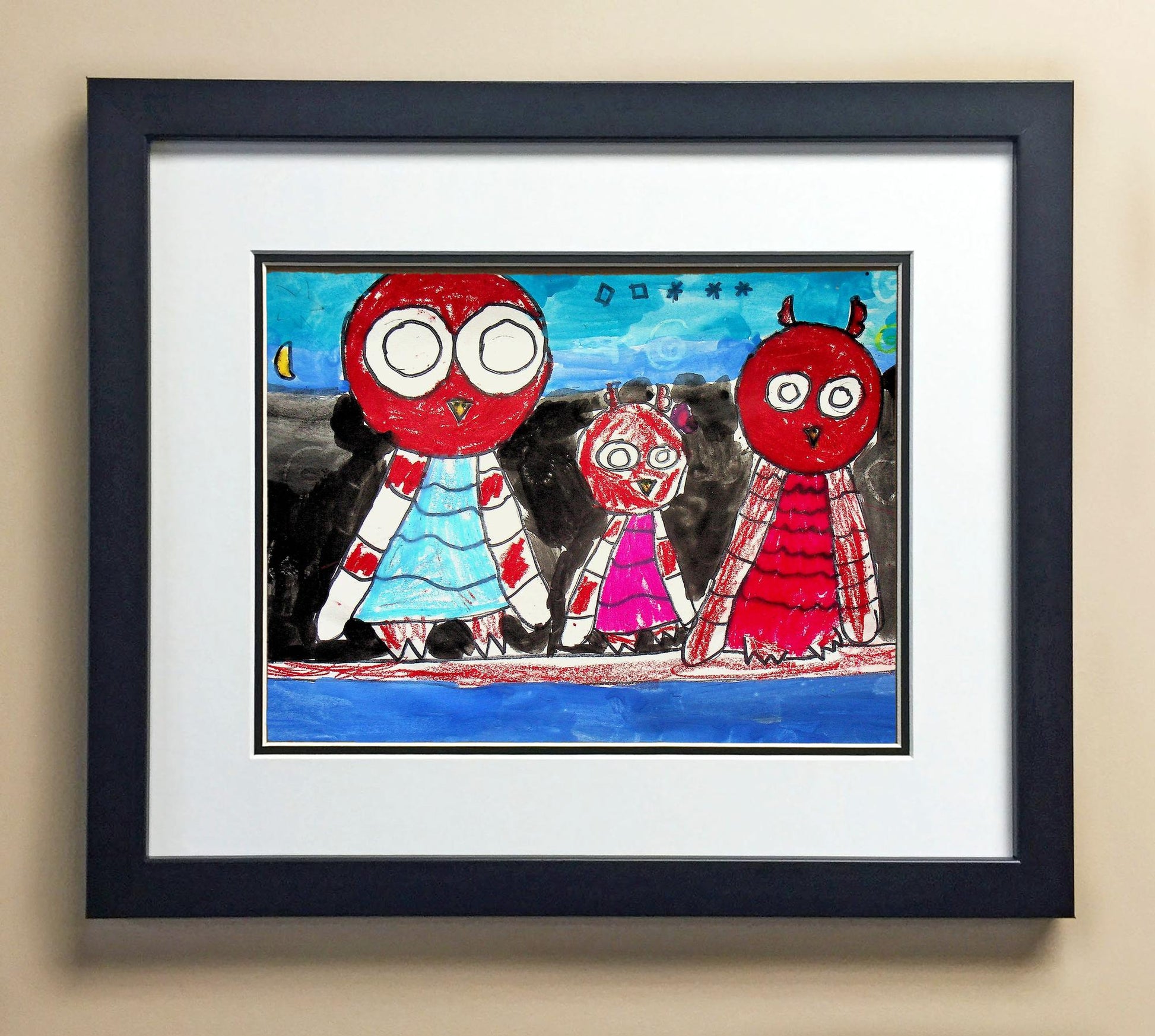 Included with the purchase is the Students Artwork, Frame, double matboard, shatter proof plexiglass, and a ready to hang backerboard with turnbuttons