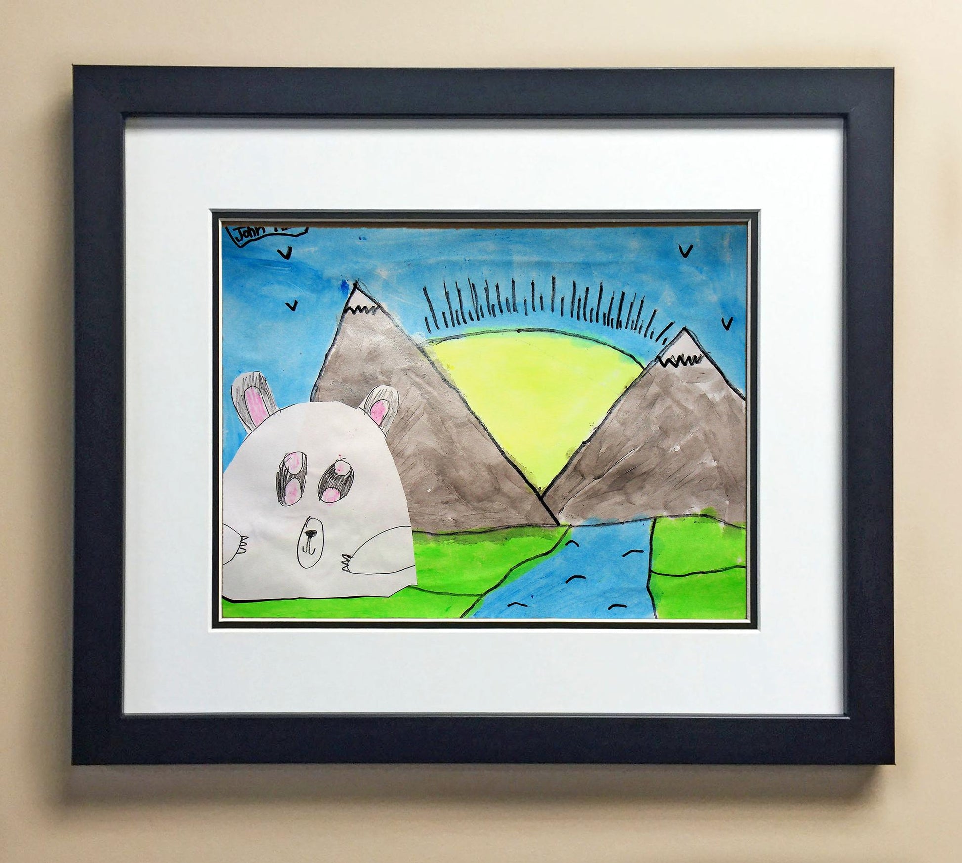 Included with the purchase is the Students Artwork, Frame, double matboard, shatter proof plexiglass, and a ready to hang backerboard with turnbuttons