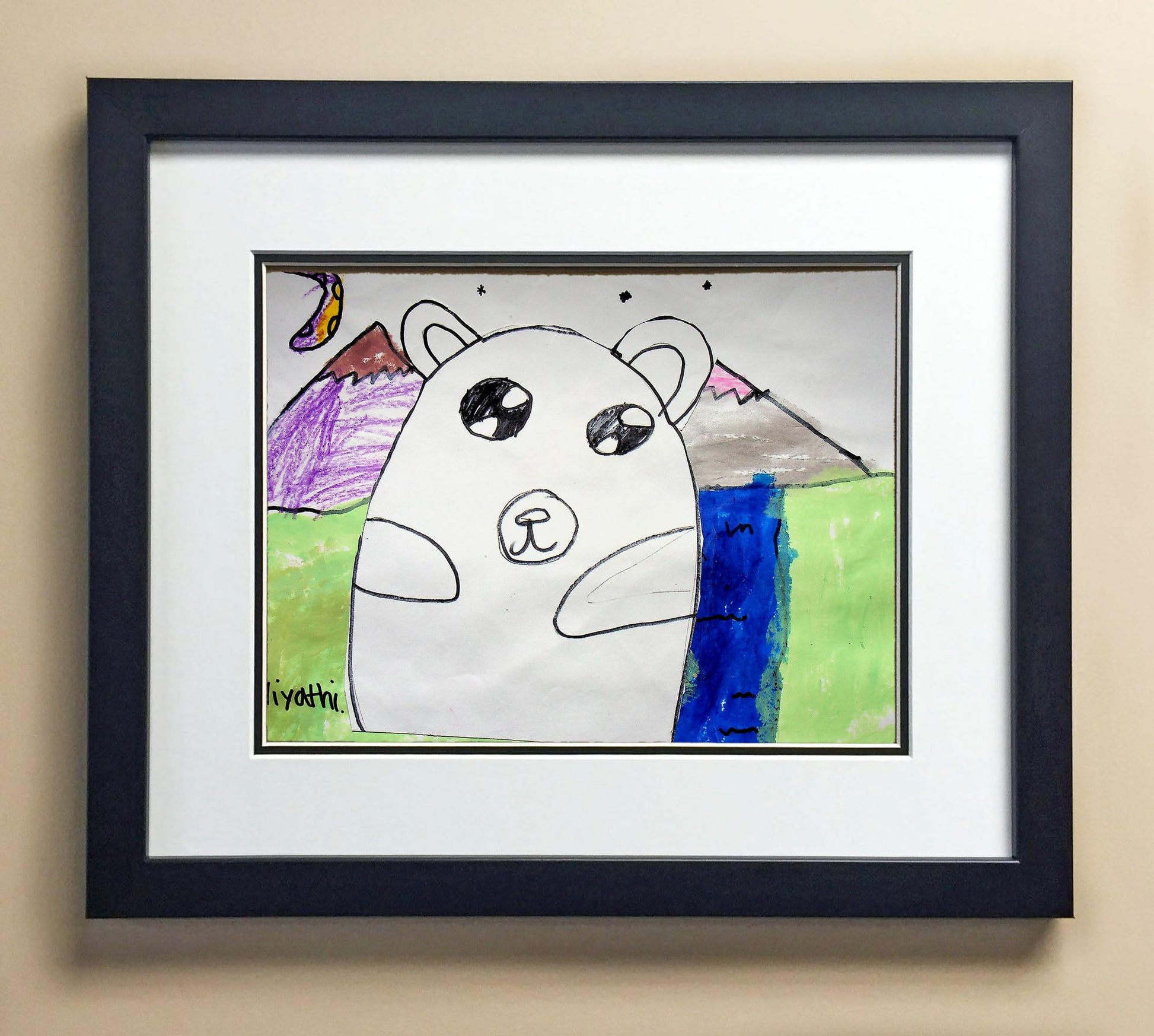 Included with the purchase is the Students Artwork, Frame, double matboard, shatter proof plexiglass, and a ready to hang backerboard with turnbuttons