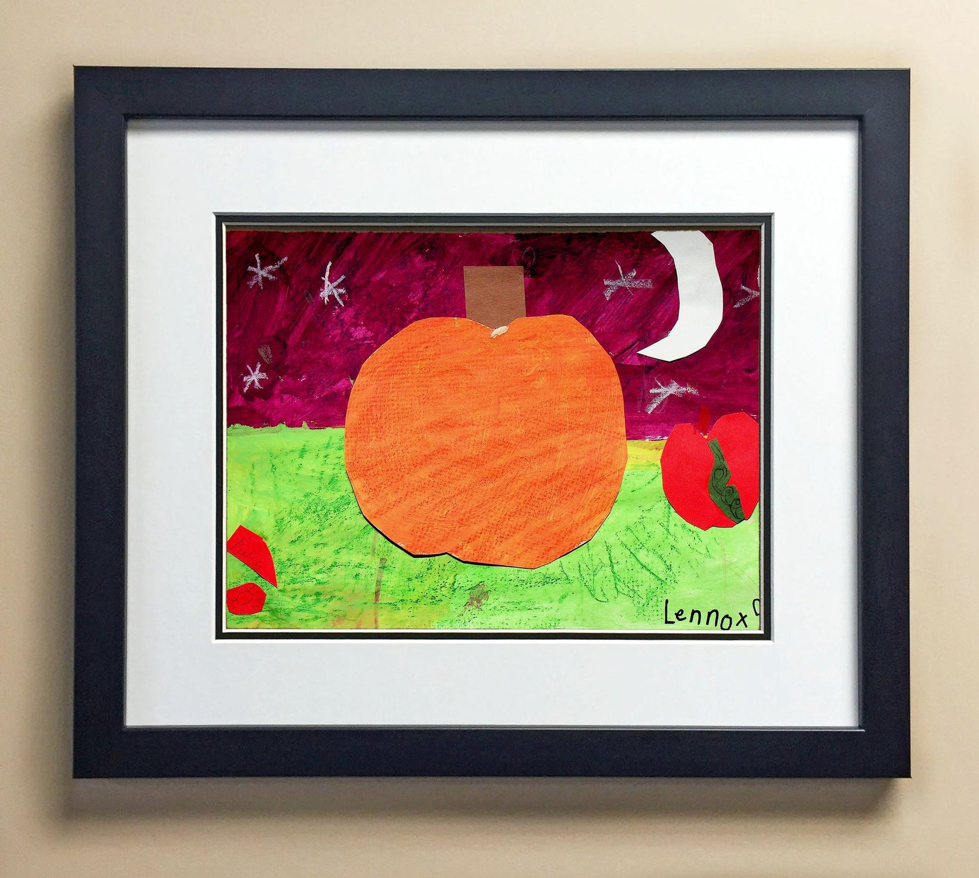 Included with the purchase is the Students Artwork, Frame, double matboard, shatter proof plexiglass, and a ready to hang backerboard with turnbuttons