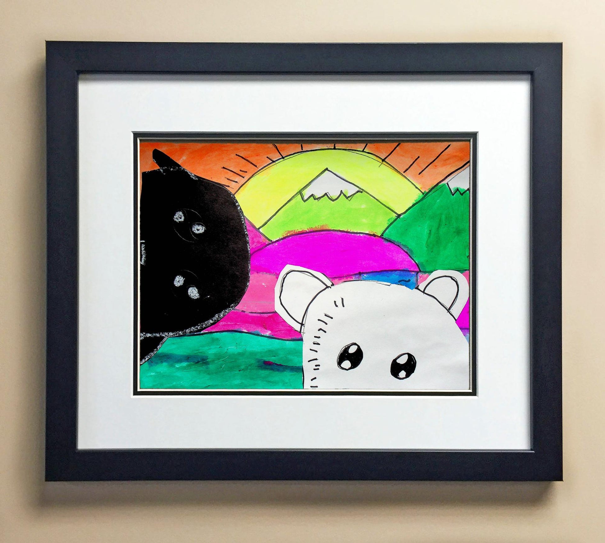 Included with the purchase is the Students Artwork, Frame, double matboard, shatter proof plexiglass, and a ready to hang backerboard with turnbuttons