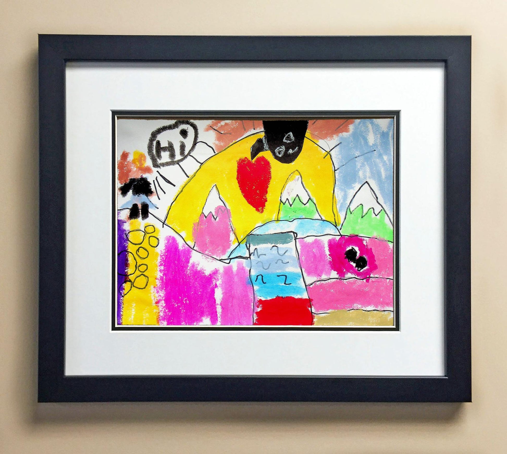 Included with the purchase is the Students Artwork, Frame, double matboard, shatter proof plexiglass, and a ready to hang backerboard with turnbuttons