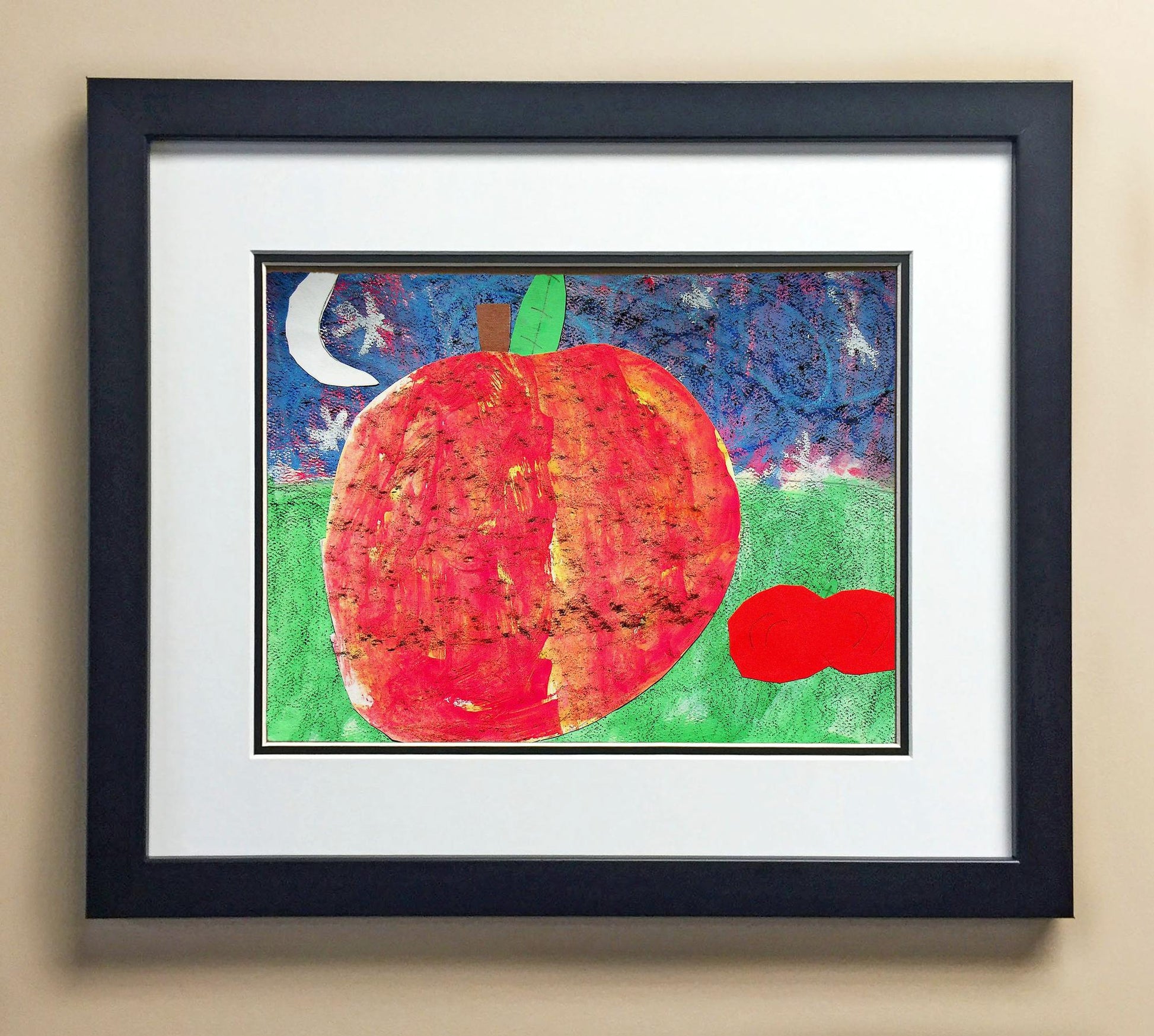 Included with the purchase is the Students Artwork, Frame, double matboard, shatter proof plexiglass, and a ready to hang backerboard with turnbuttons