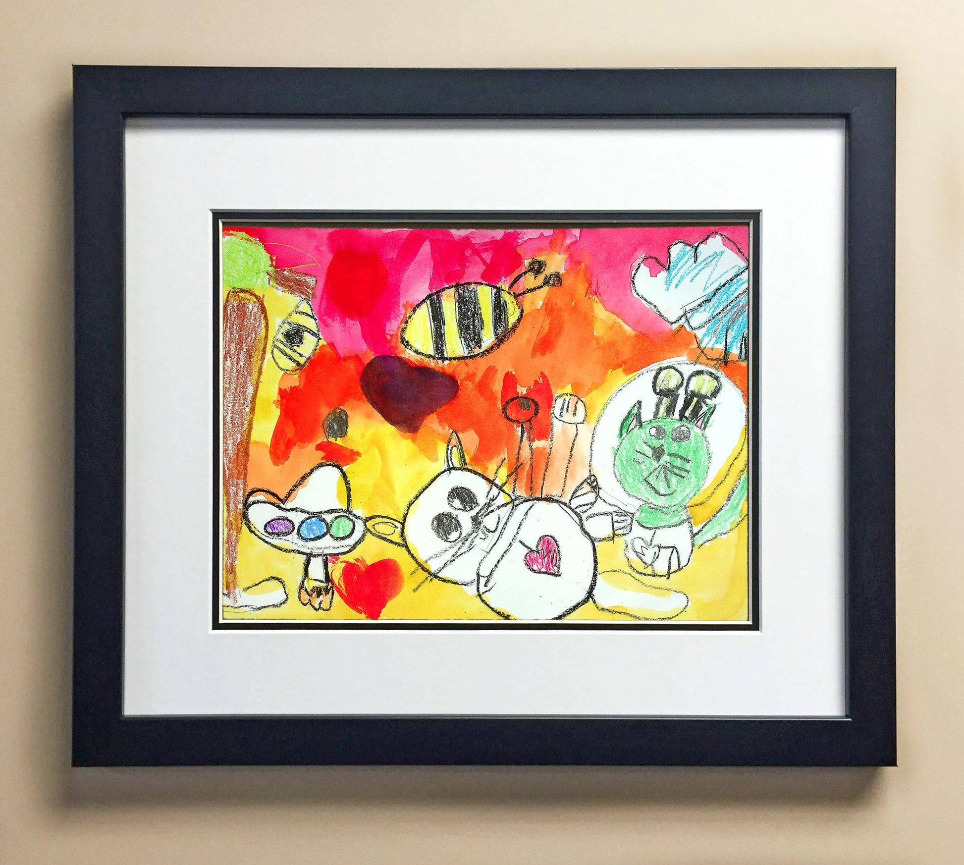 Included with the purchase is the Students Artwork, Frame, double matboard, shatter proof plexiglass, and a ready to hang backerboard with turnbuttons