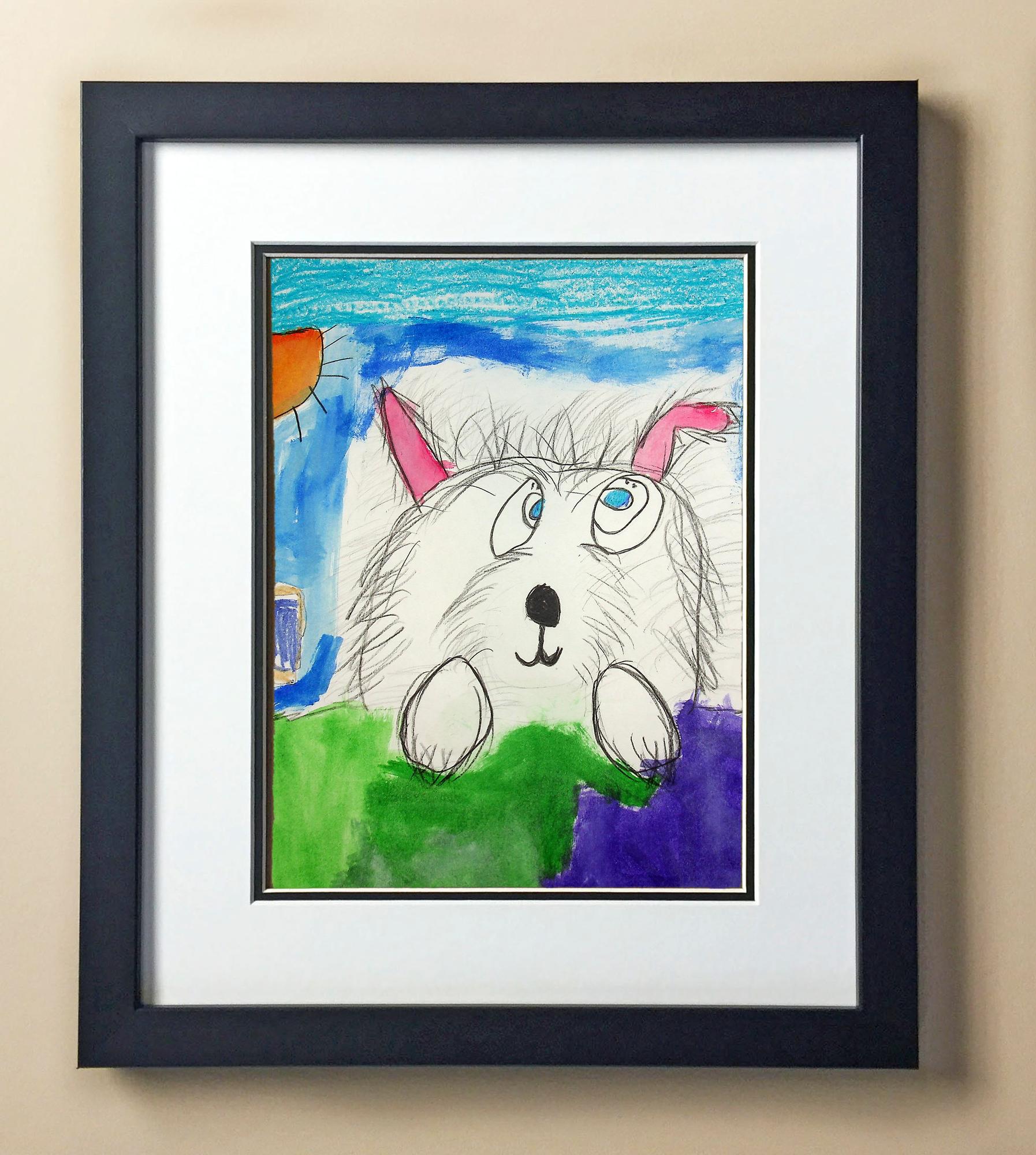 Included with the purchase is the Students Artwork, Frame, double matboard, shatter proof plexiglass, and a ready to hang backerboard with turnbuttons