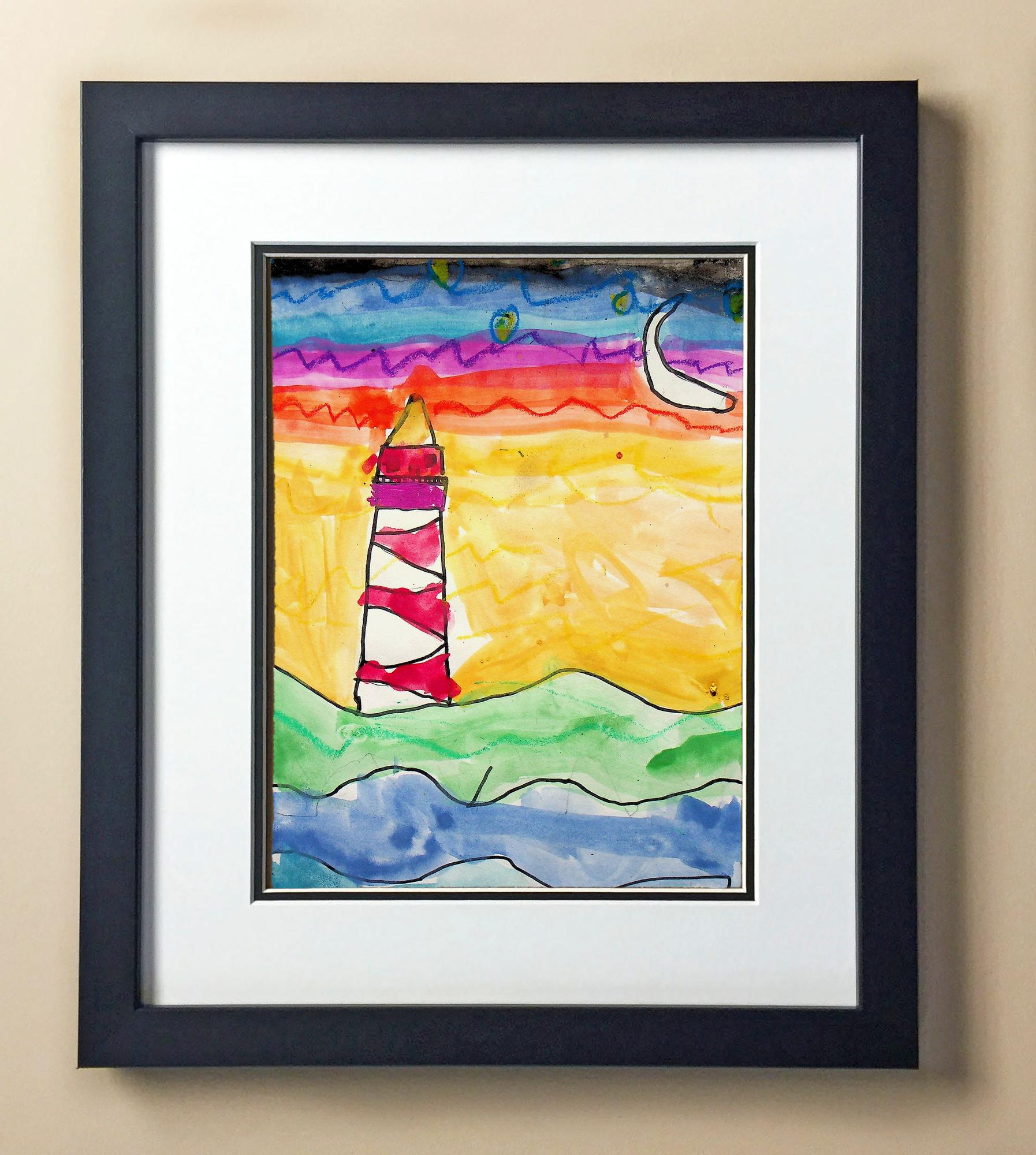 Included with the purchase is the Students Artwork, Frame, double matboard, shatter proof plexiglass, and a ready to hang backerboard with turnbuttons