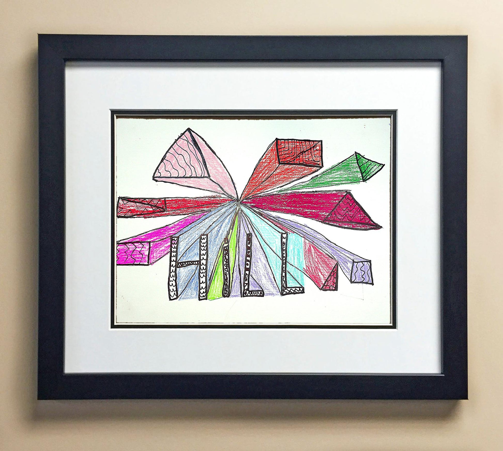 Included with the purchase is the Students Artwork, Frame, double matboard, shatter proof plexiglass, and a ready to hang backerboard with turnbuttons