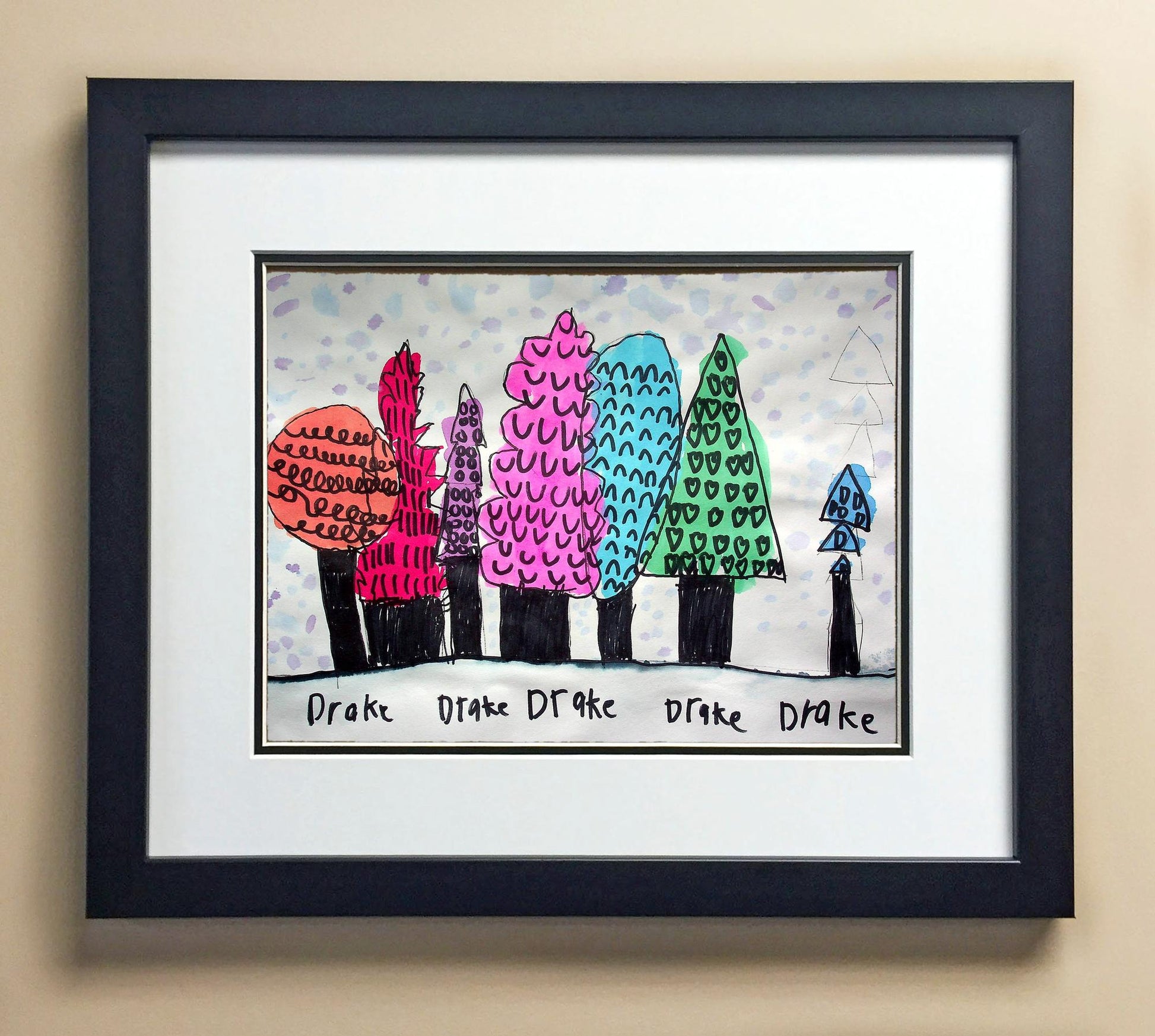 Included with the purchase is the Students Artwork, Frame, double matboard, shatter proof plexiglass, and a ready to hang backerboard with turnbuttons