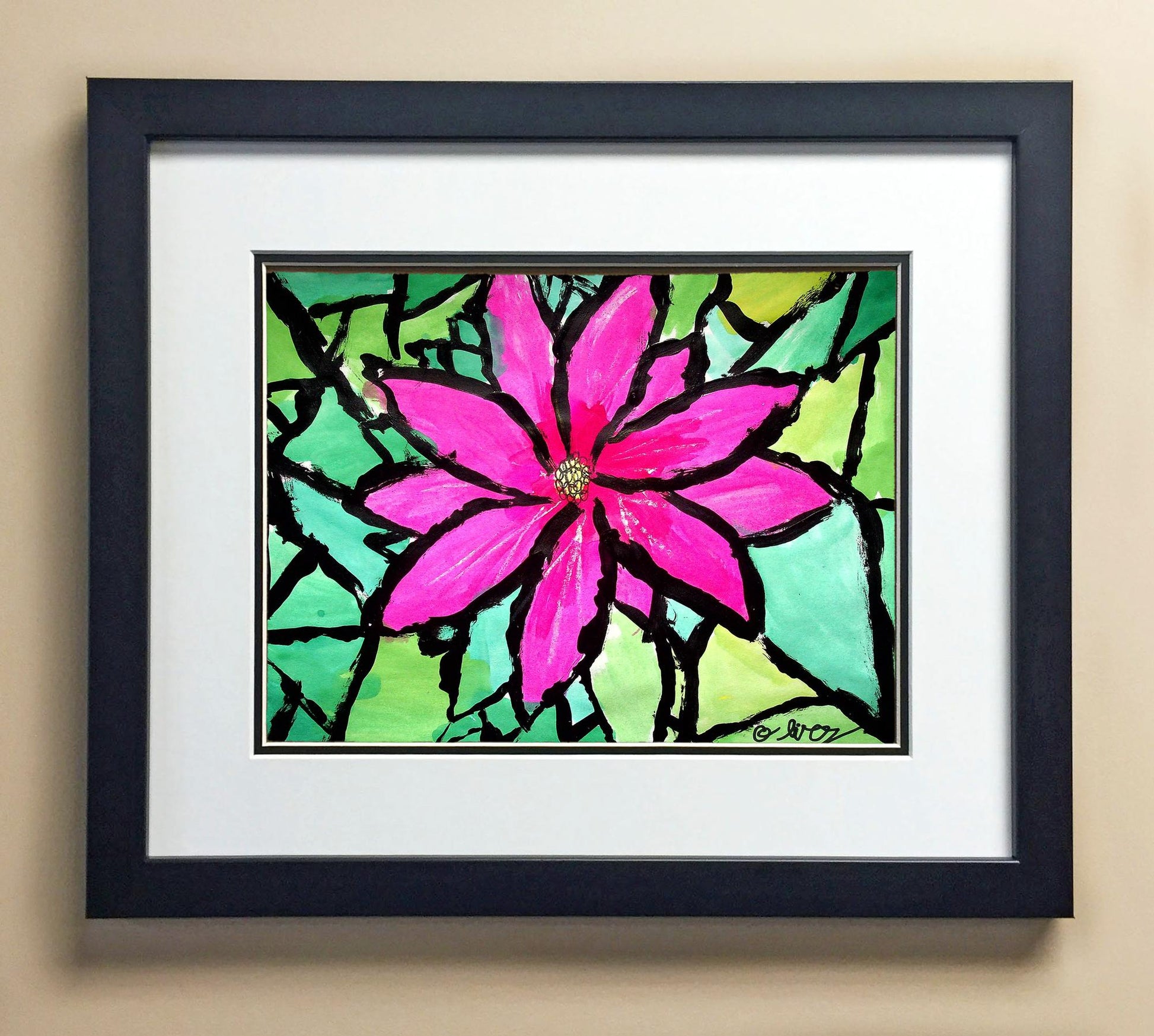 Included with the purchase is the Students Artwork, Frame, double matboard, shatter proof plexiglass, and a ready to hang backerboard with turnbuttons