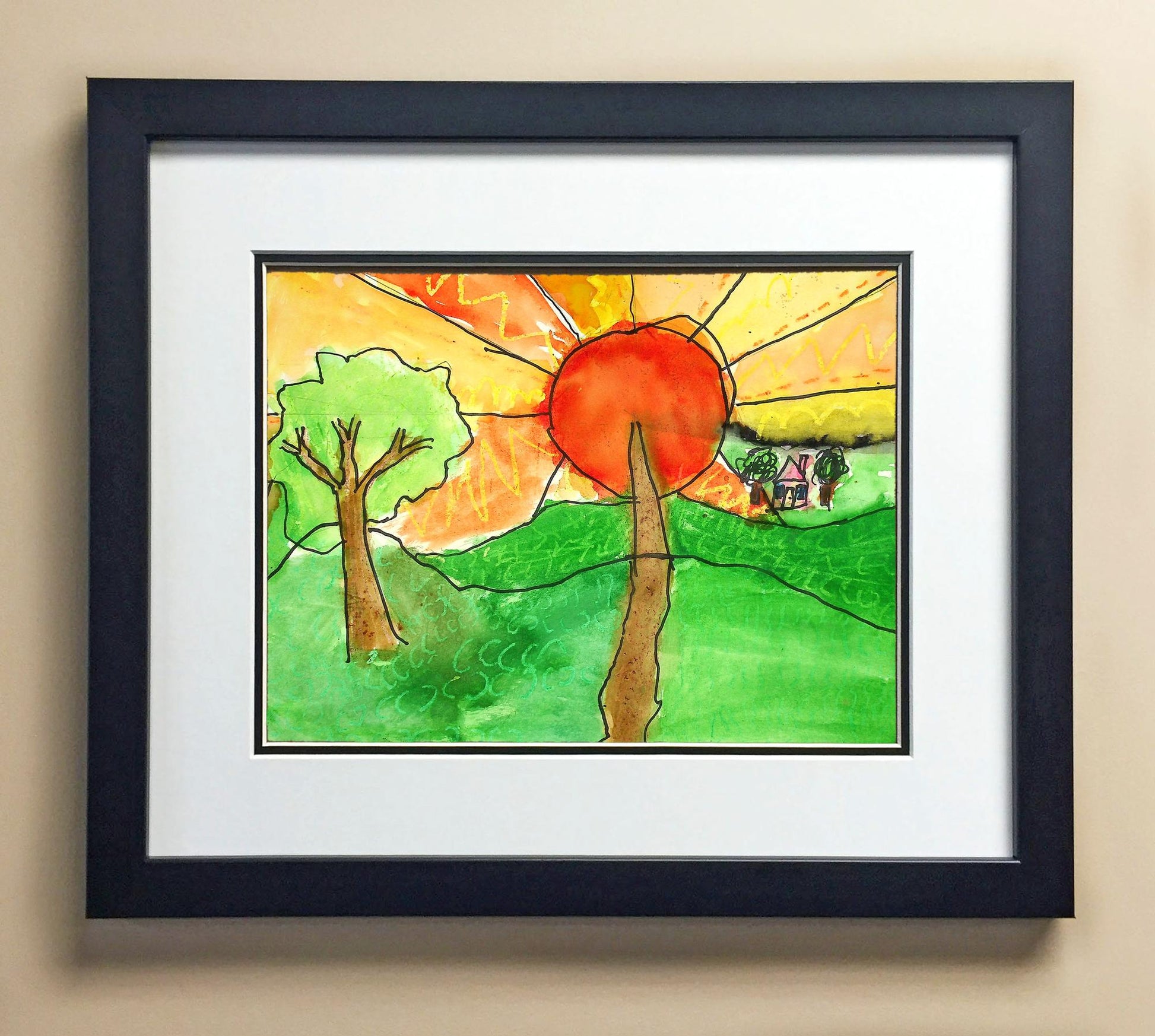 Included with the purchase is the Students Artwork, Frame, double matboard, shatter proof plexiglass, and a ready to hang backerboard with turnbuttons