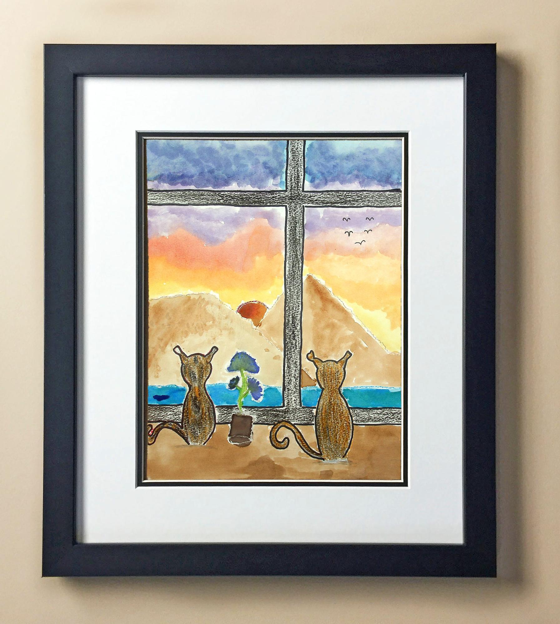 Included with the purchase is the Students Artwork, Frame, double matboard, shatter proof plexiglass, and a ready to hang backerboard with turnbuttons