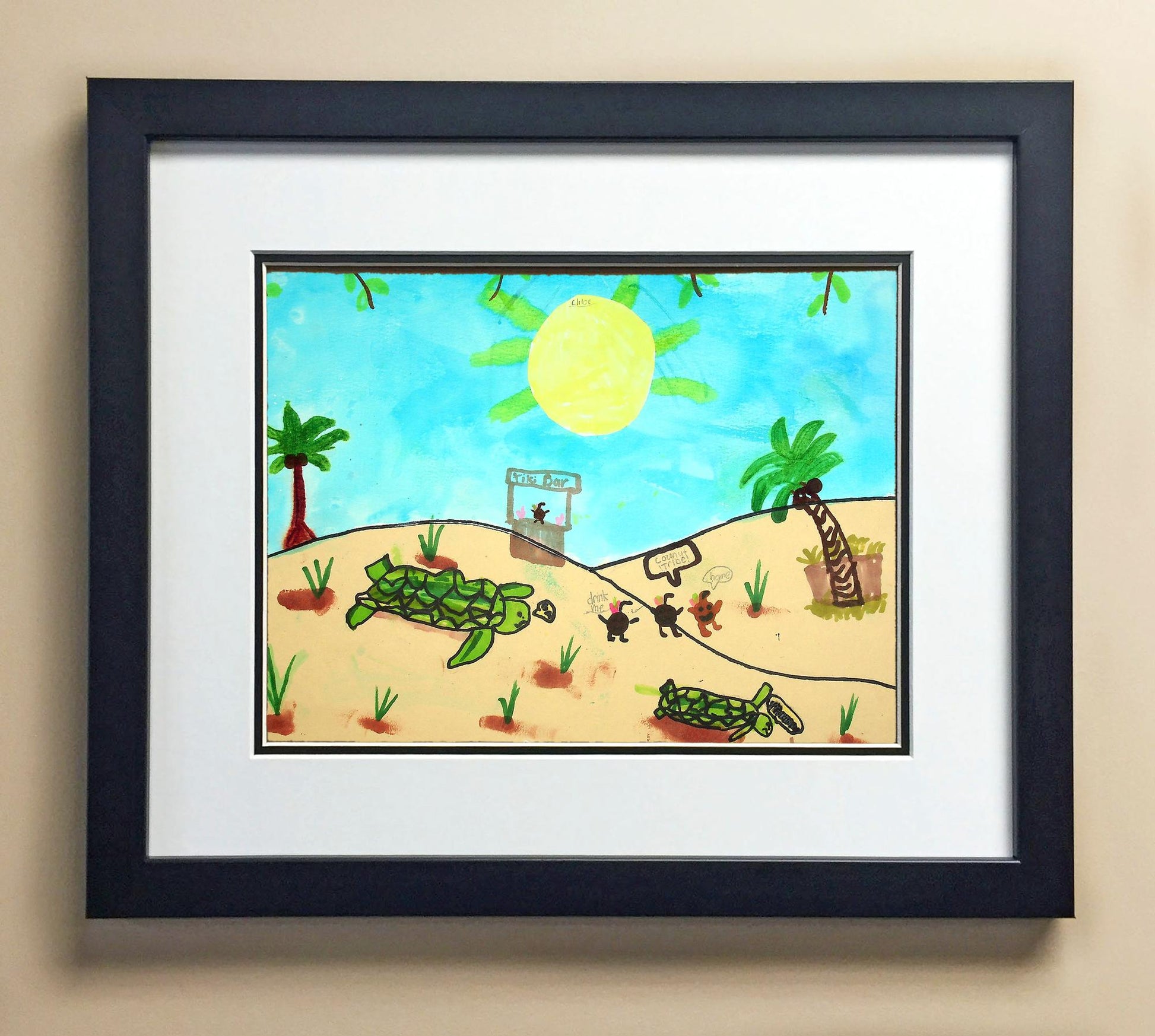 Included with the purchase is the Students Artwork, Frame, double matboard, shatter proof plexiglass, and a ready to hang backerboard with turnbuttons