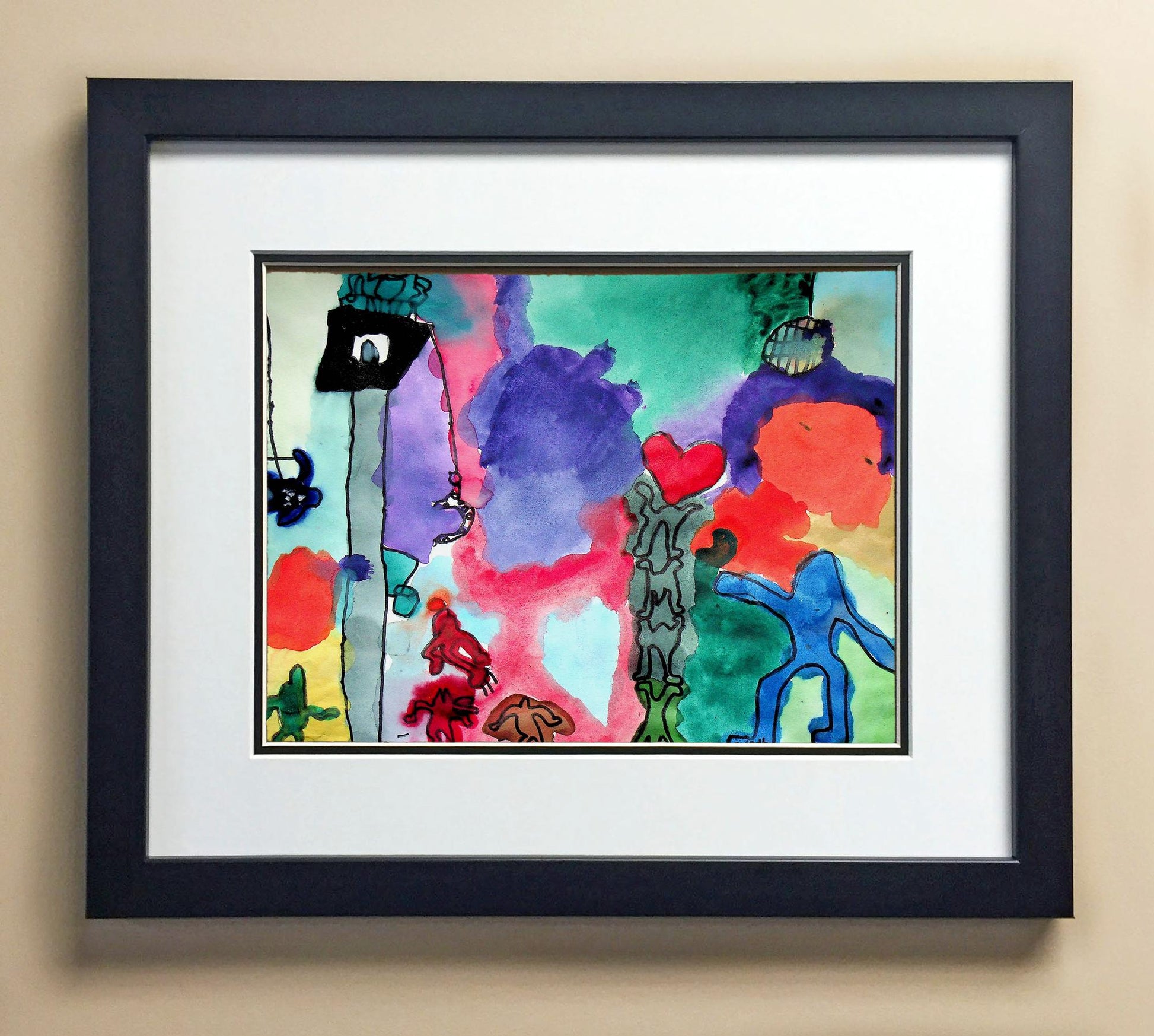 Included with the purchase is the Students Artwork, Frame, double matboard, shatter proof plexiglass, and a ready to hang backerboard with turnbuttons