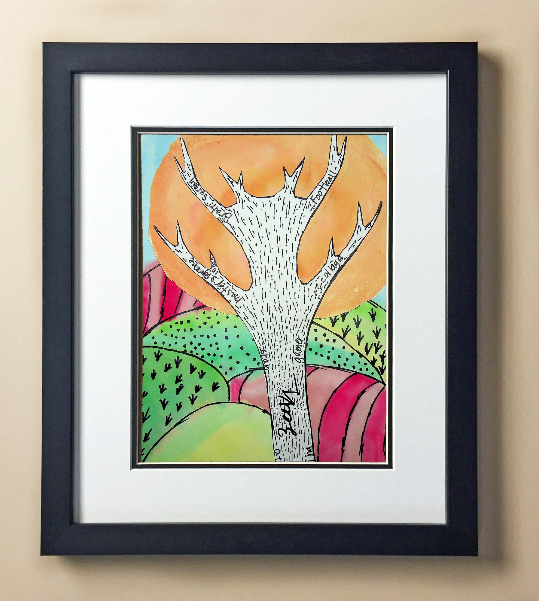 Included with the purchase is the Students Artwork, Frame, double matboard, shatter proof plexiglass, and a ready to hang backerboard with turnbuttons