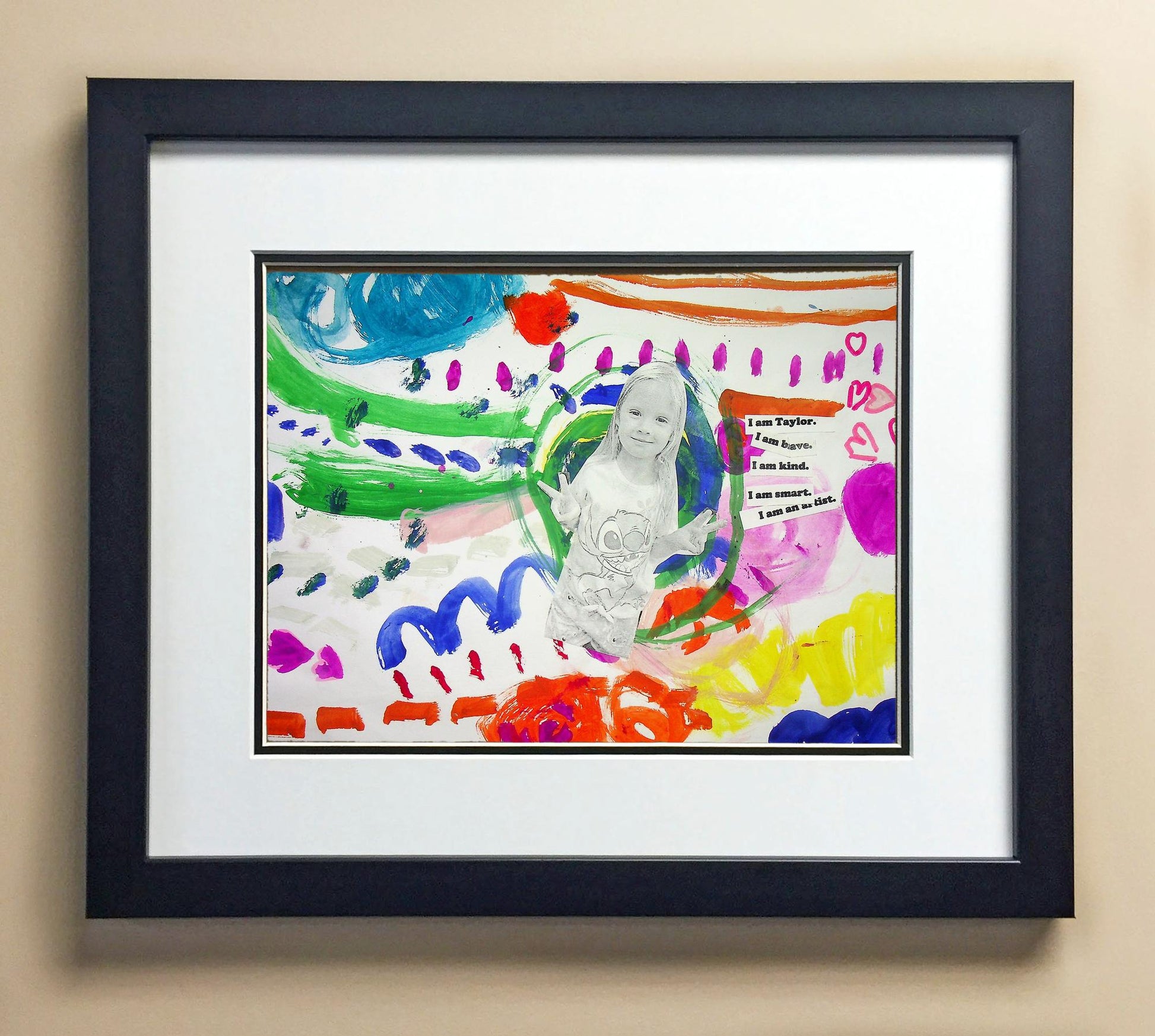 Included with the purchase is the Students Artwork, Frame, double matboard, shatter proof plexiglass, and a ready to hang backerboard with turnbuttons