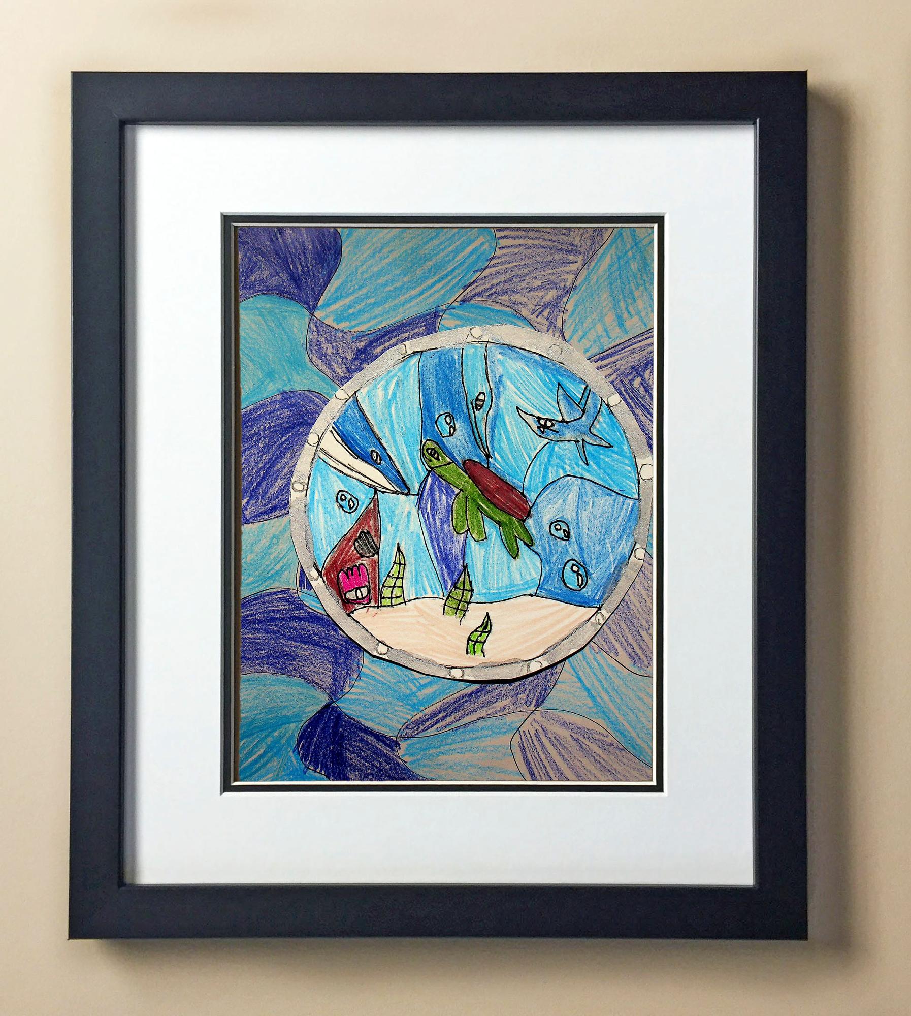 Included with the purchase is the Students Artwork, Frame, double matboard, shatter proof plexiglass, and a ready to hang backerboard with turnbuttons