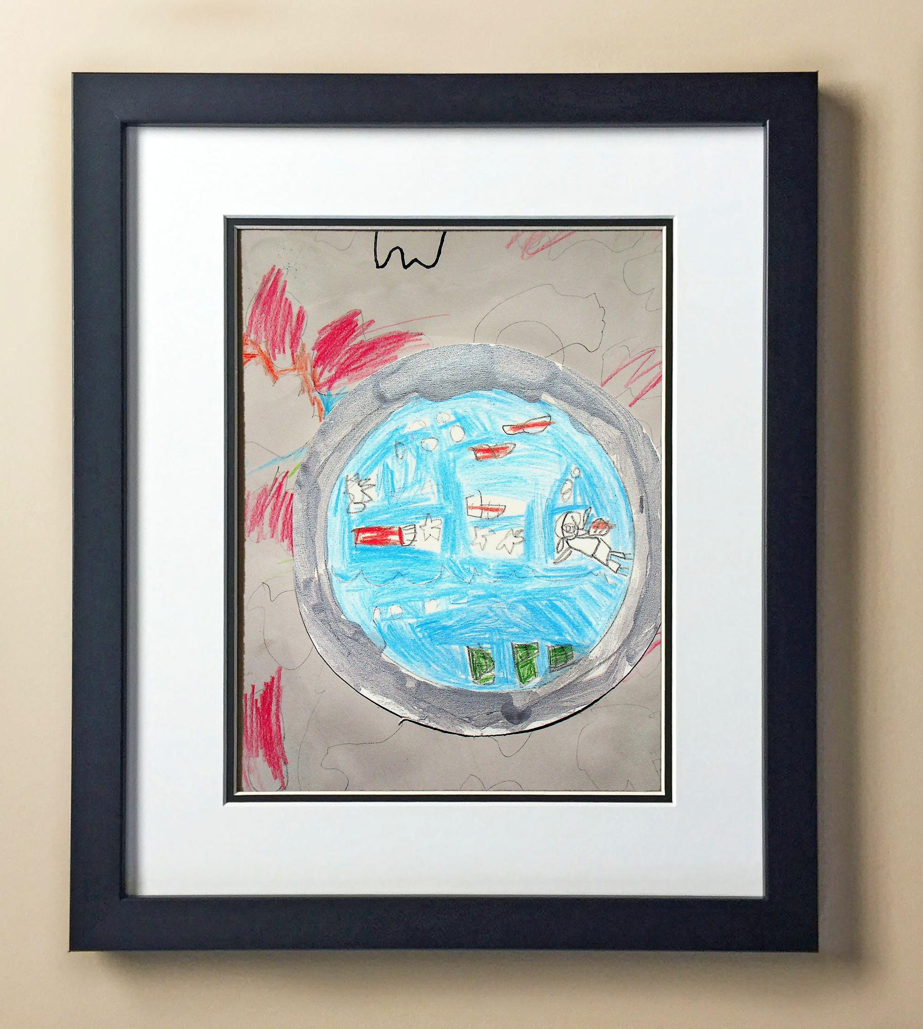 Included with the purchase is the Students Artwork, Frame, double matboard, shatter proof plexiglass, and a ready to hang backerboard with turnbuttons