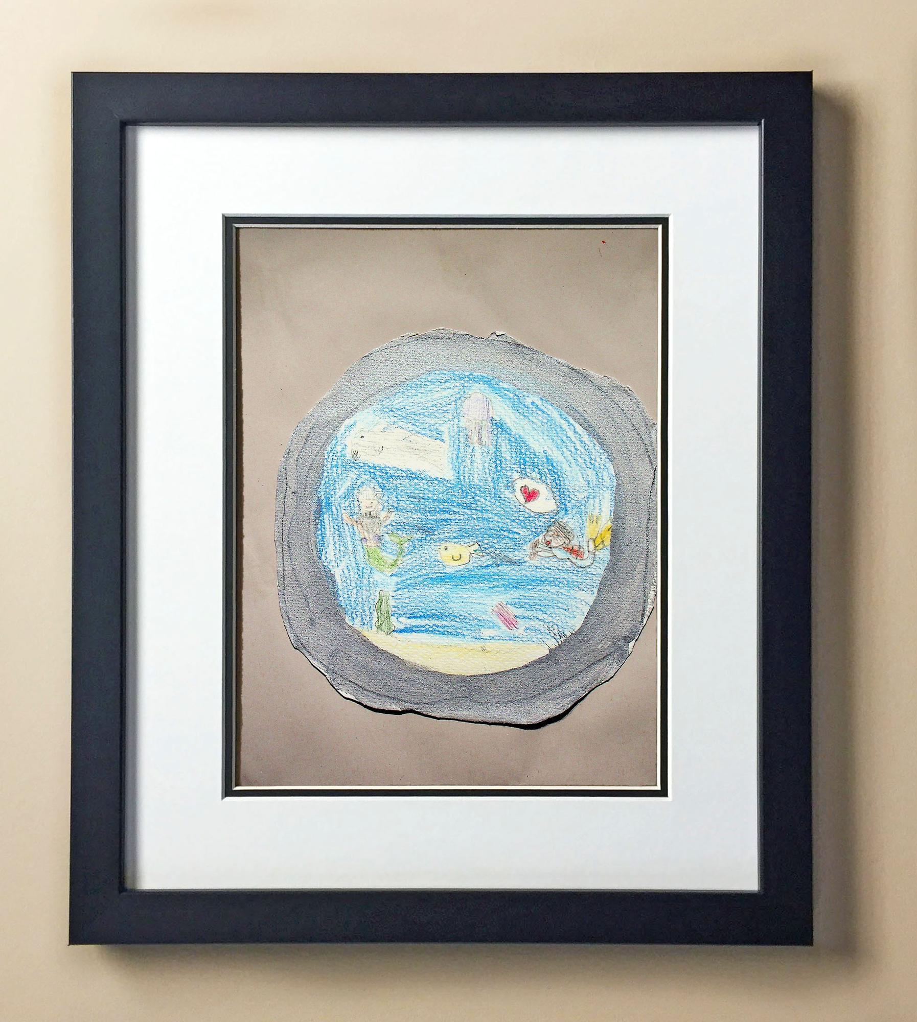 Included with the purchase is the Students Artwork, Frame, double matboard, shatter proof plexiglass, and a ready to hang backerboard with turnbuttons