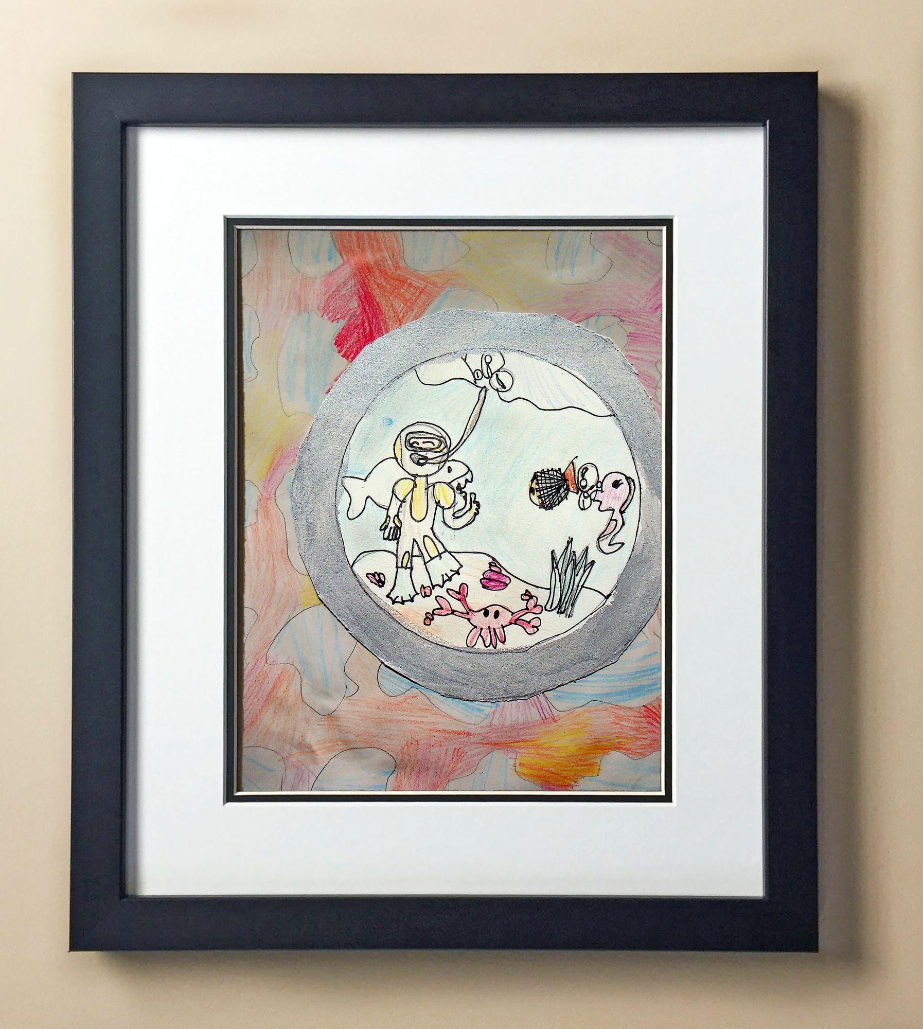 Included with the purchase is the Students Artwork, Frame, double matboard, shatter proof plexiglass, and a ready to hang backerboard with turnbuttons