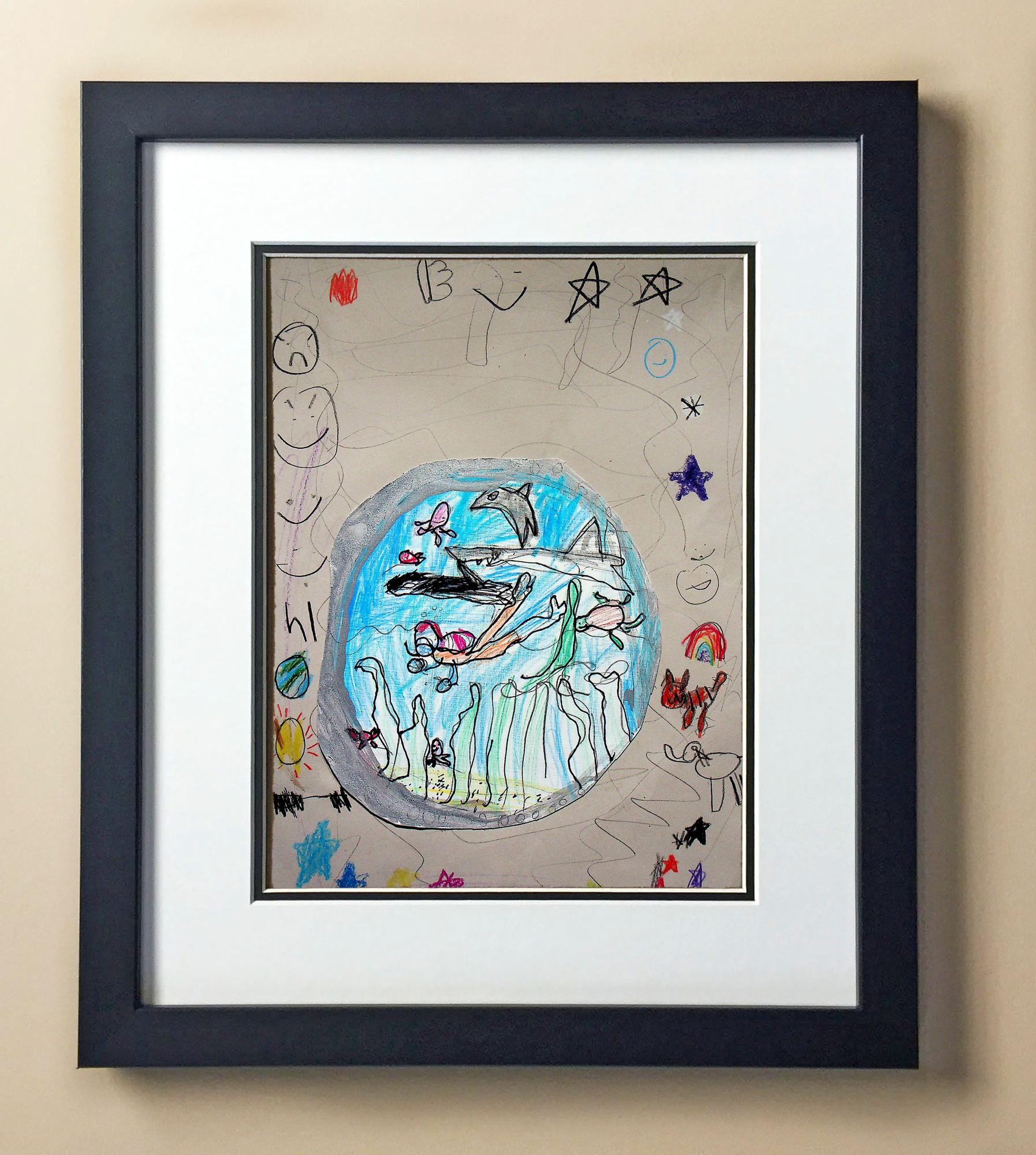 Included with the purchase is the Students Artwork, Frame, double matboard, shatter proof plexiglass, and a ready to hang backerboard with turnbuttons