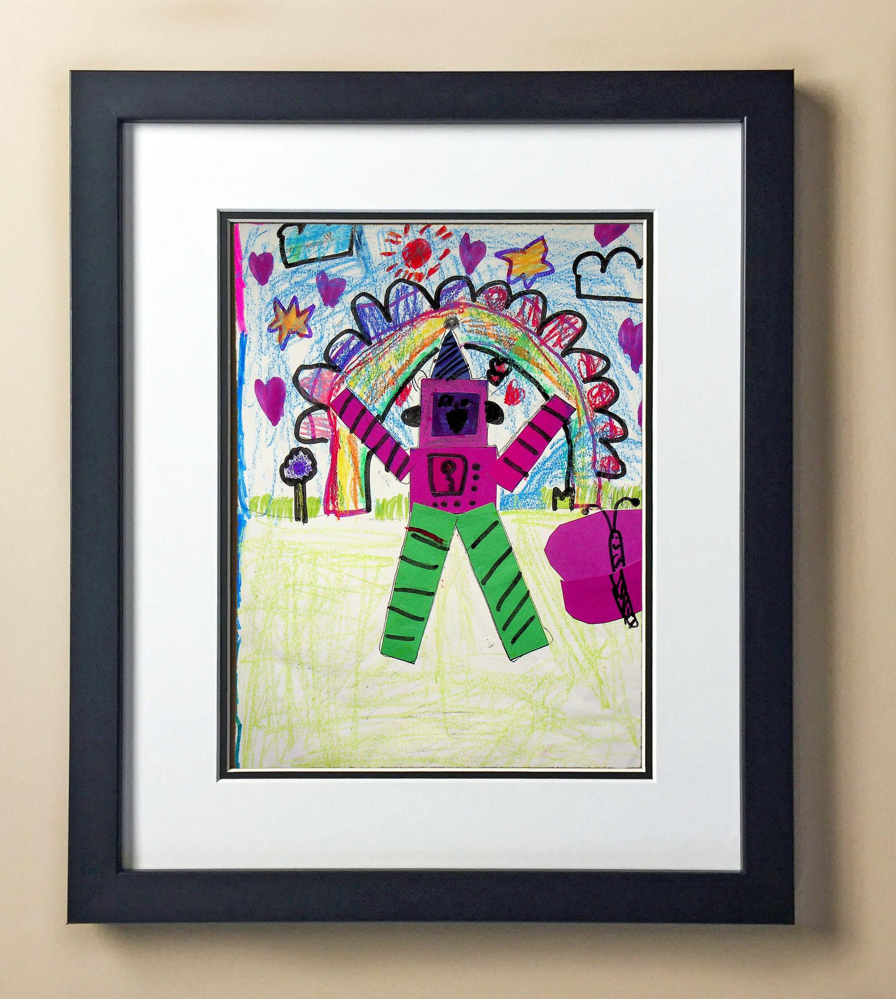 Included with the purchase is the Students Artwork, Frame, double matboard, shatter proof plexiglass, and a ready to hang backerboard with turnbuttons