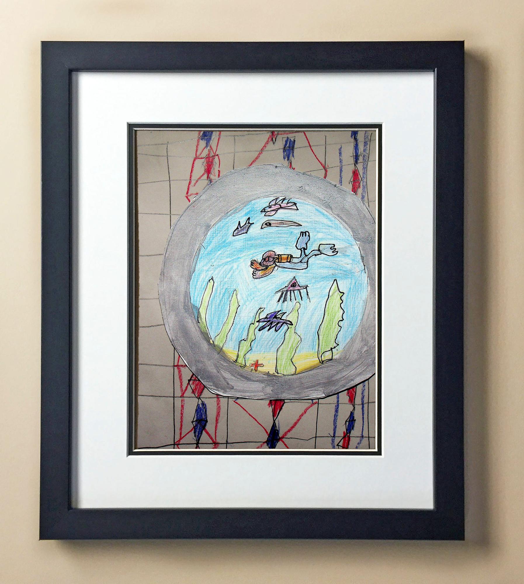 Included with the purchase is the Students Artwork, Frame, double matboard, shatter proof plexiglass, and a ready to hang backerboard with turnbuttons