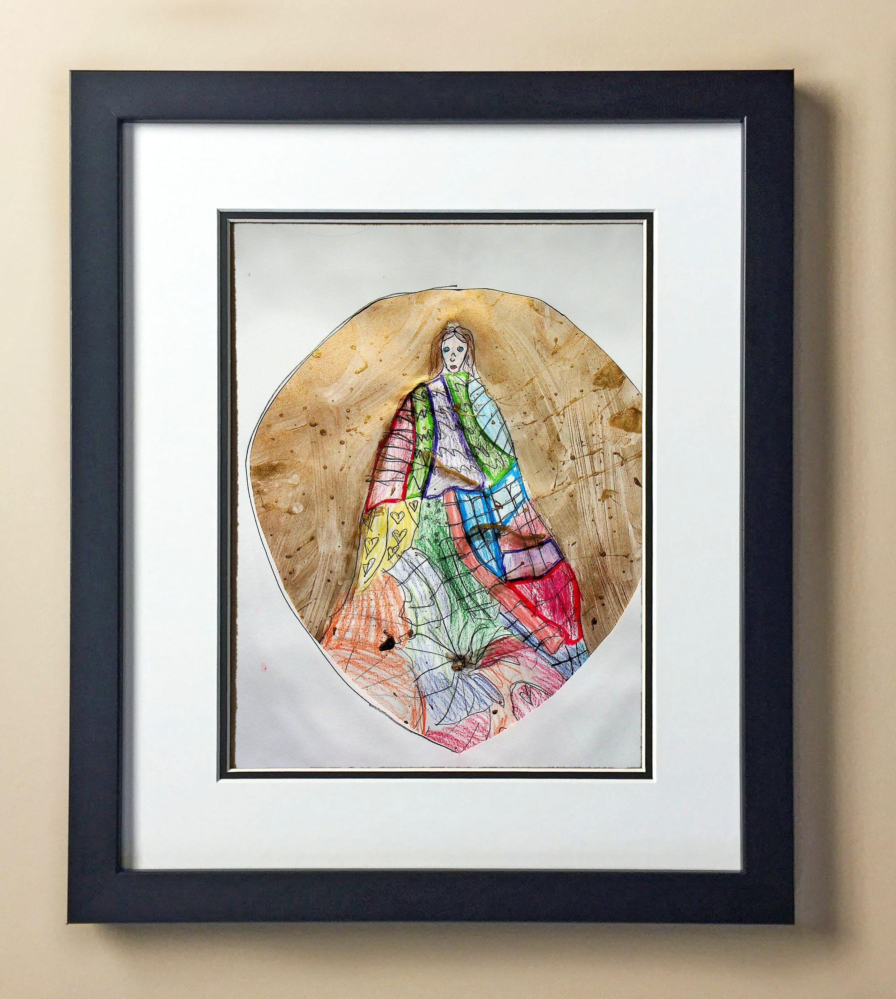 Included with the purchase is the Students Artwork, Frame, double matboard, shatter proof plexiglass, and a ready to hang backerboard with turnbuttons