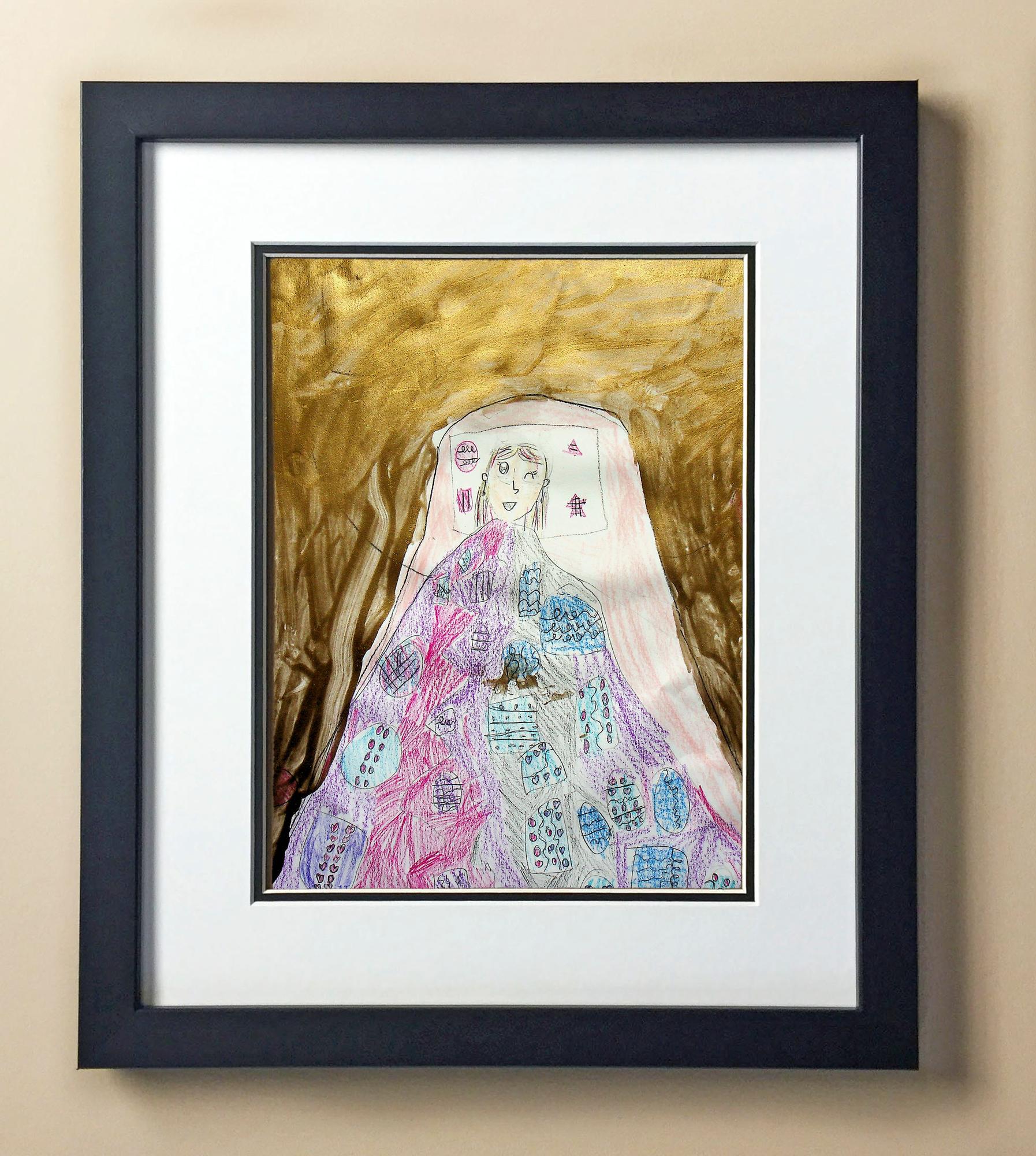Included with the purchase is the Students Artwork, Frame, double matboard, shatter proof plexiglass, and a ready to hang backerboard with turnbuttons