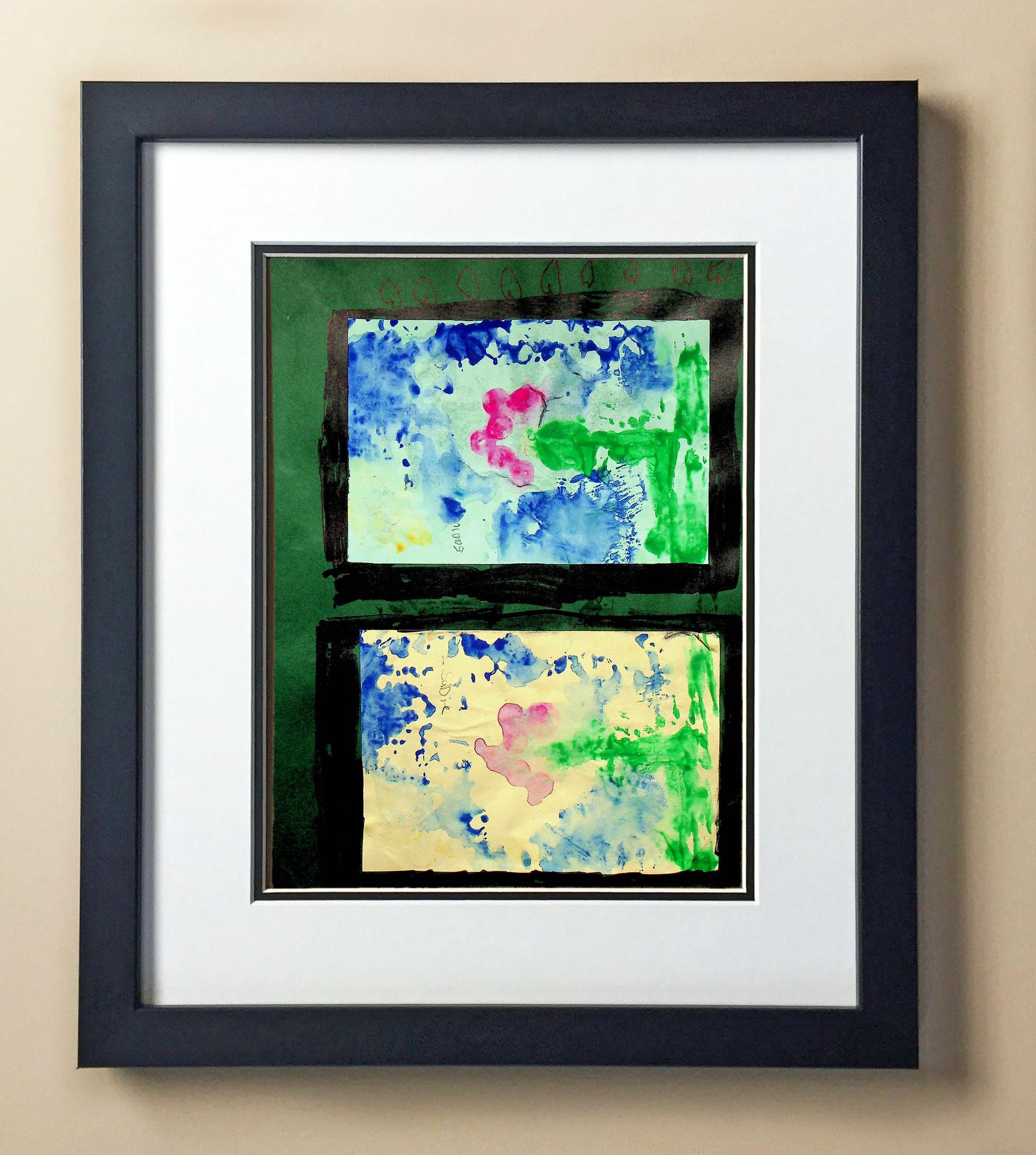 Included with the purchase is the Students Artwork, Frame, double matboard, shatter proof plexiglass, and a ready to hang backerboard with turnbuttons