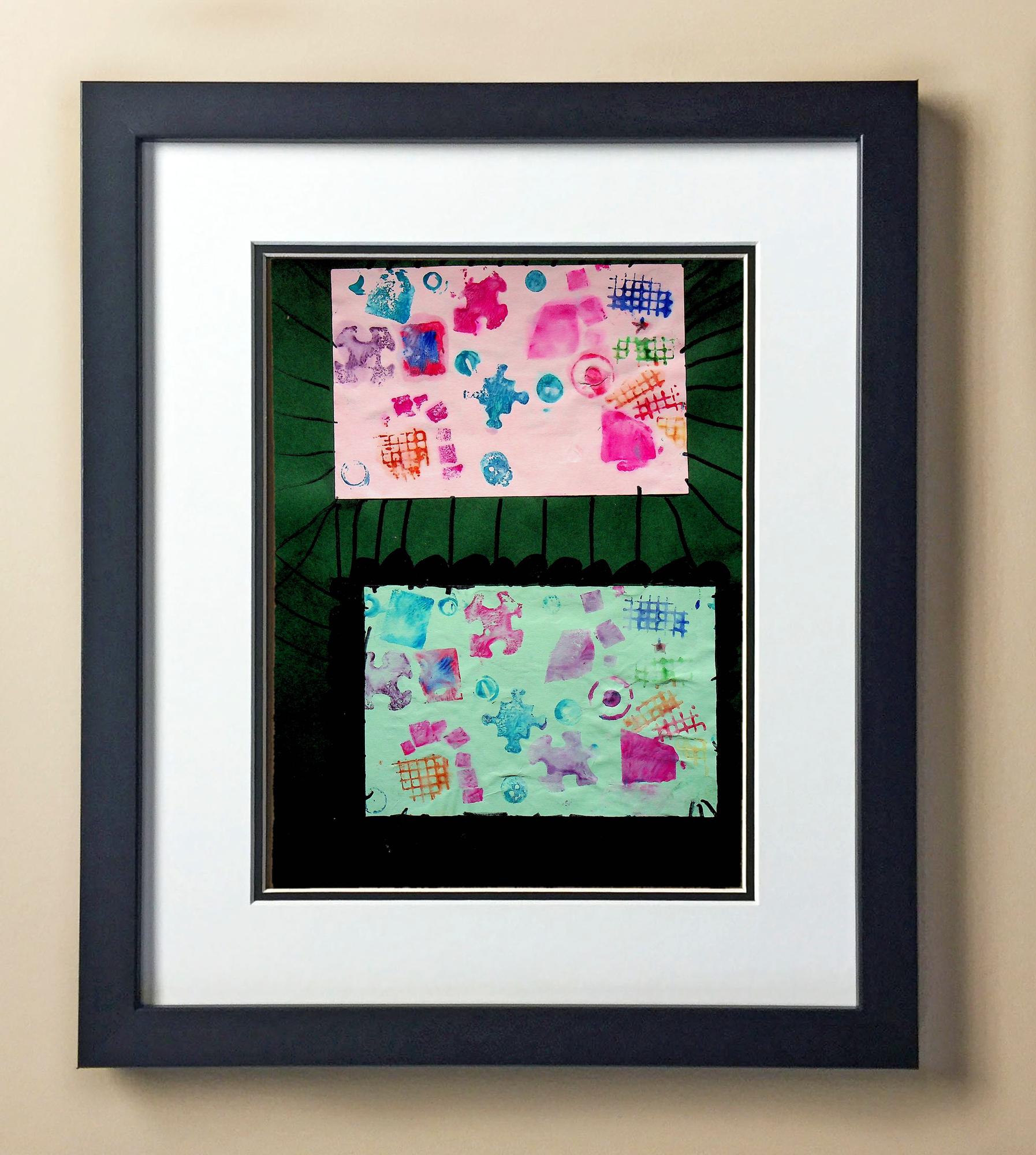 Included with the purchase is the Students Artwork, Frame, double matboard, shatter proof plexiglass, and a ready to hang backerboard with turnbuttons